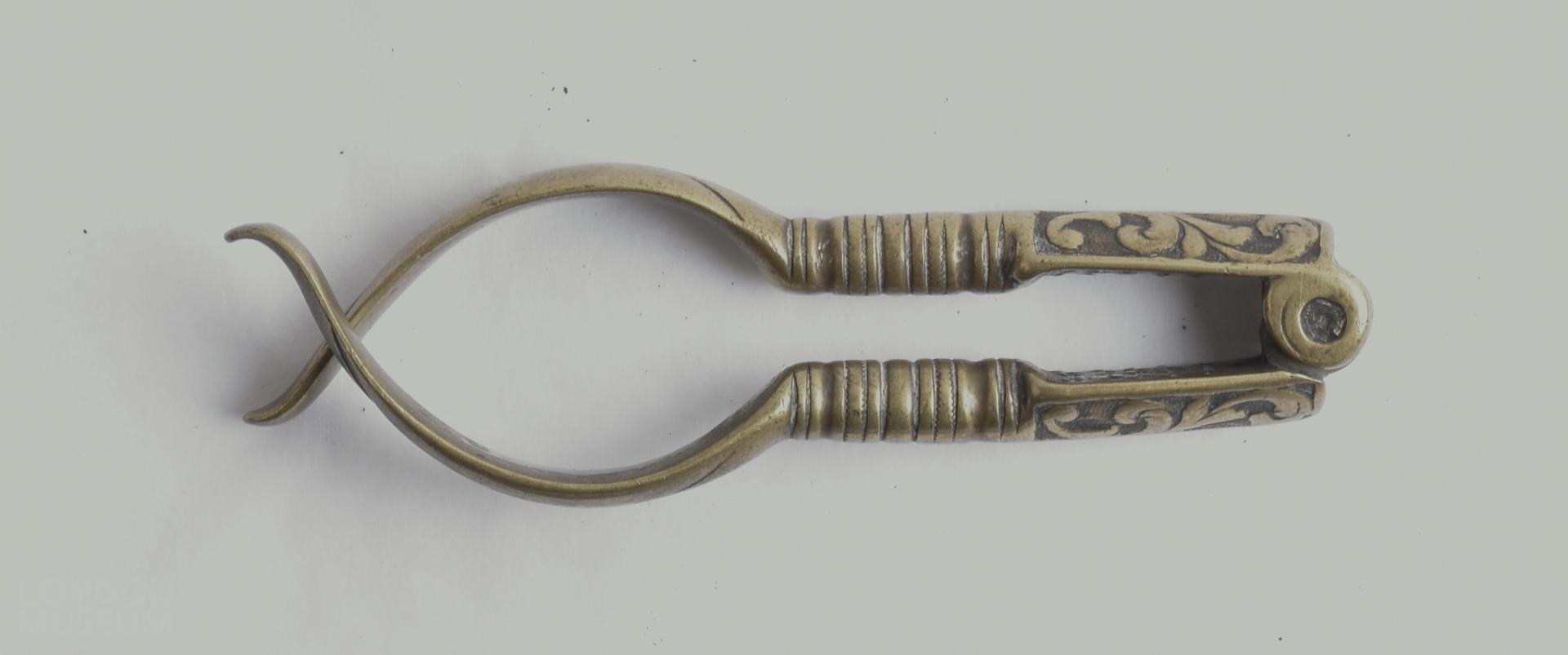 Copper alloy nutcrackers featuring an elaborate floral decoration. Marked with the initials 'TB' on one handle.