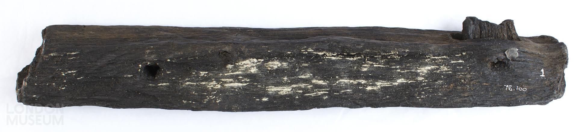 Wooden fragment from near apse of Mithras Temple. 2 side pieces with a cross-batten at top and bottom. Panelling, bearing traces of original red paint, was nailed to cross-battens.