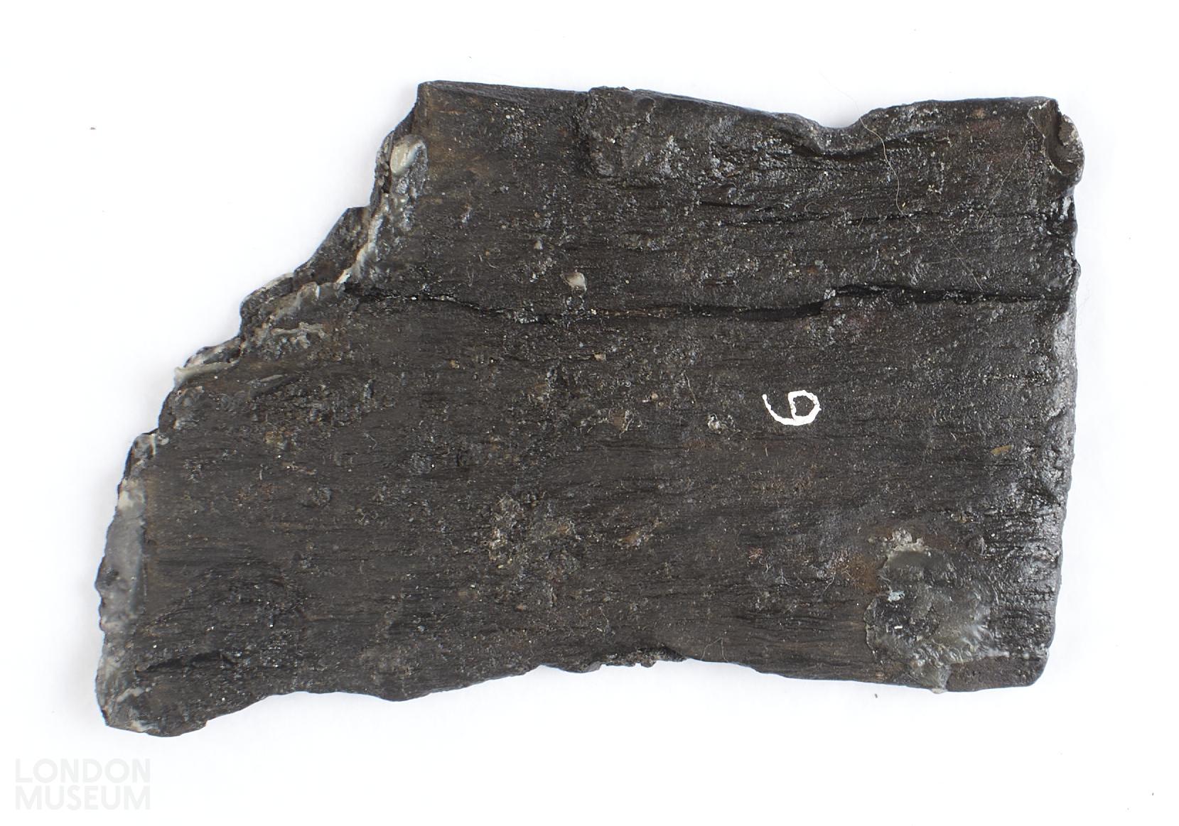 Wooden fragment from near apse of Mithras Temple. 2 side pieces with a cross-batten at top and bottom. Panelling, bearing traces of original red paint, was nailed to cross-battens.