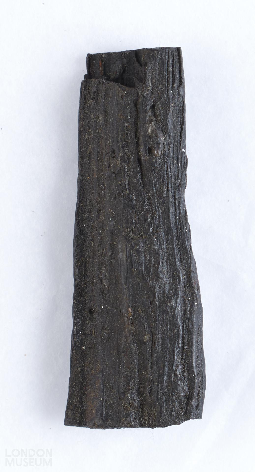 Wooden fragment from near apse of Mithras Temple. 2 side pieces with a cross-batten at top and bottom. Panelling, bearing traces of original red paint, was nailed to cross-battens.