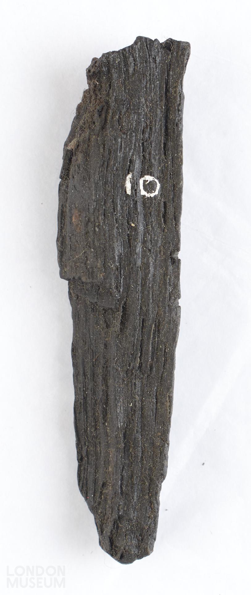 Wooden fragment from near apse of Mithras Temple. 2 side pieces with a cross-batten at top and bottom. Panelling, bearing traces of original red paint, was nailed to cross-battens.