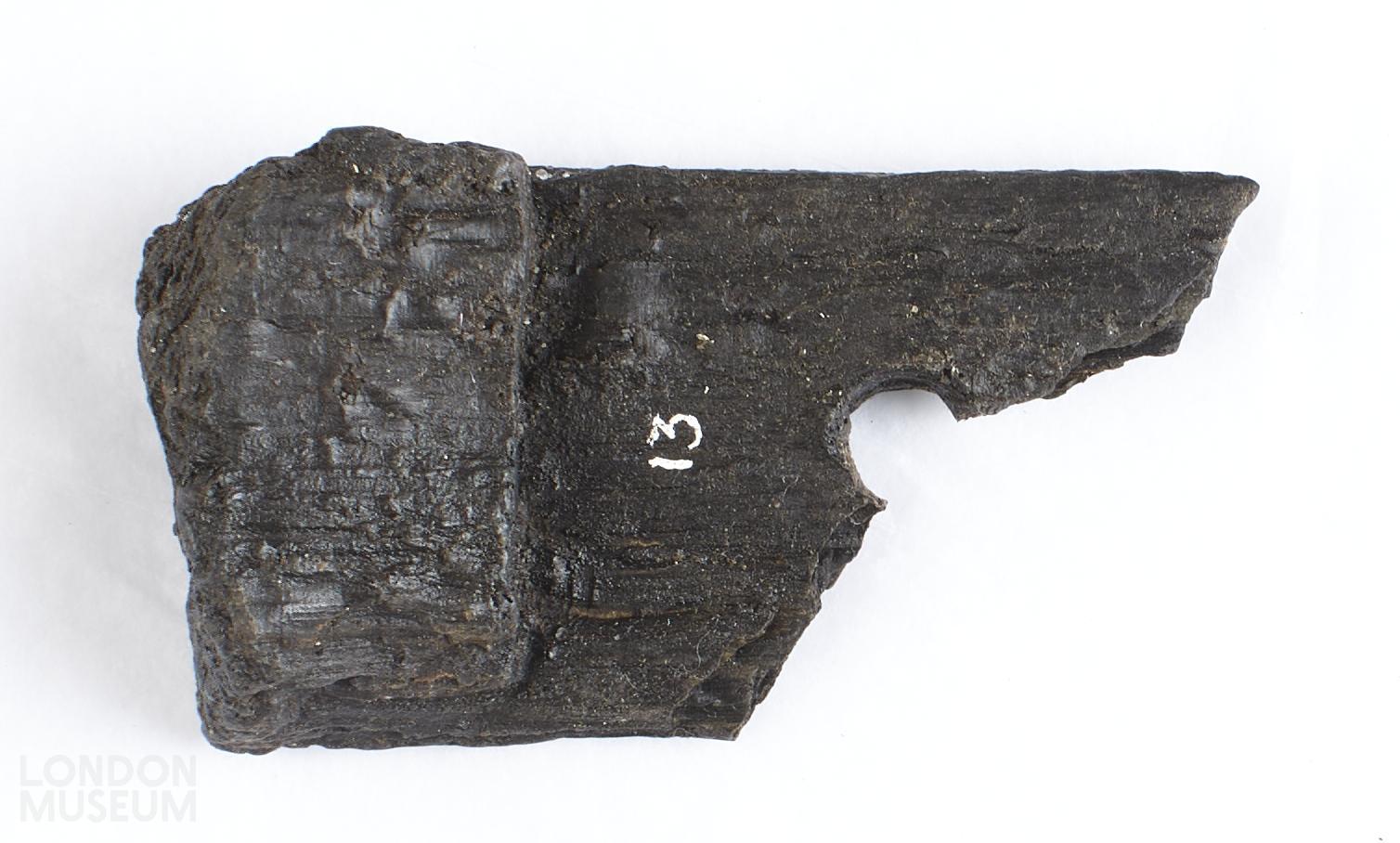 Wooden fragment from near apse of Mithras Temple. 2 side pieces with a cross-batten at top and bottom. Panelling, bearing traces of original red paint, was nailed to cross-battens.