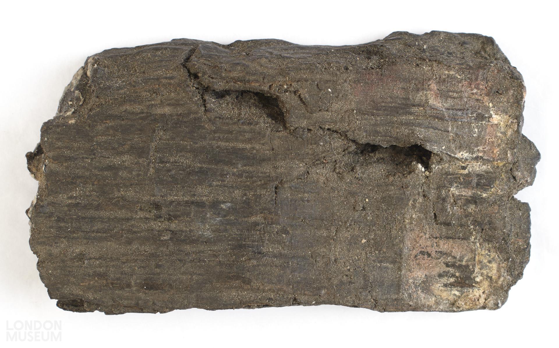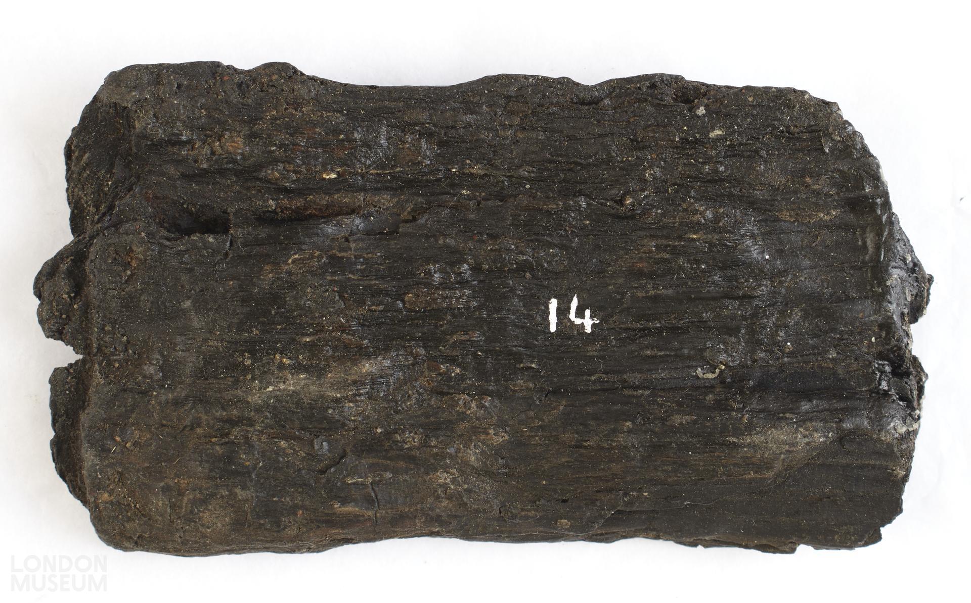 Wooden fragment from near apse of Mithras Temple. 2 side pieces with a cross-batten at top and bottom. Panelling, bearing traces of original red paint, was nailed to cross-battens.