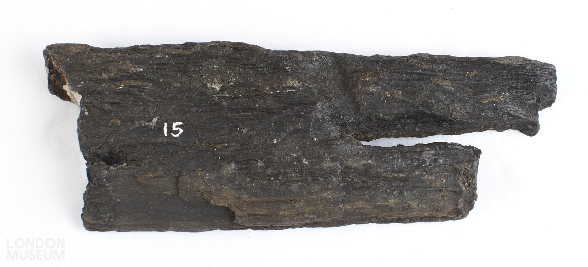 Wooden fragment from near apse of Mithras Temple. 2 side pieces with a cross-batten at top and bottom. Panelling, bearing traces of original red paint, was nailed to cross-battens.