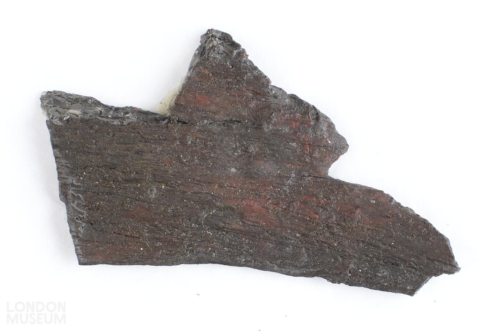 Wooden fragment from near apse of Mithras Temple. 2 side pieces with a cross-batten at top and bottom. Panelling, bearing traces of original red paint, was nailed to cross-battens.