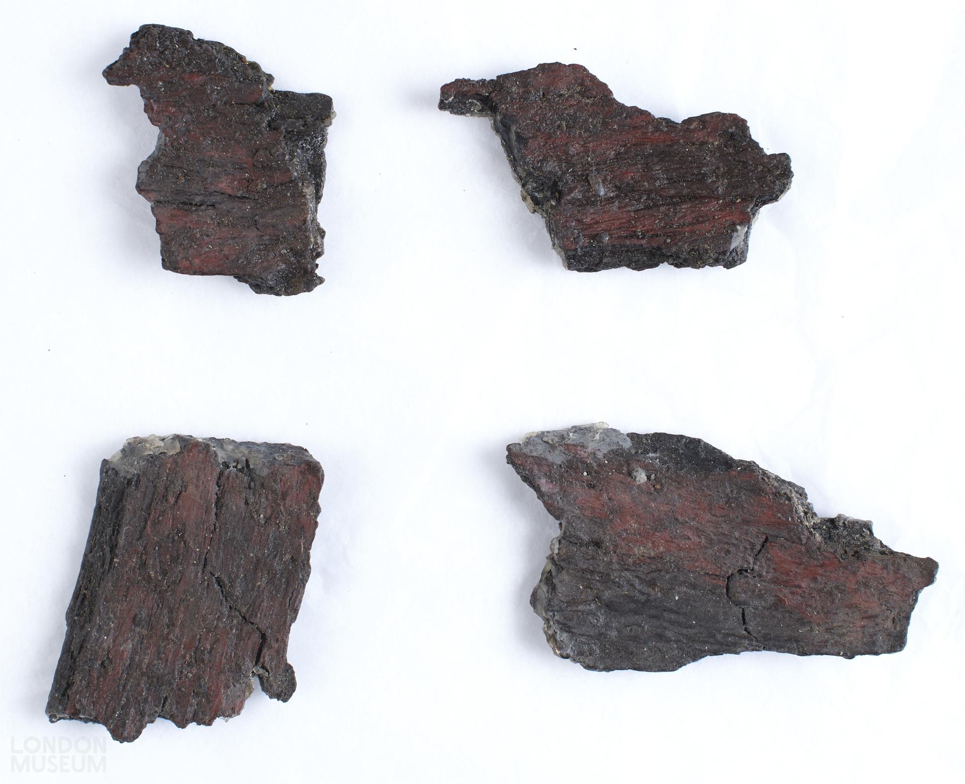 Wooden fragment from near apse of Mithras Temple. 2 side pieces with a cross-batten at top and bottom. Panelling, bearing traces of original red paint, was nailed to cross-battens.