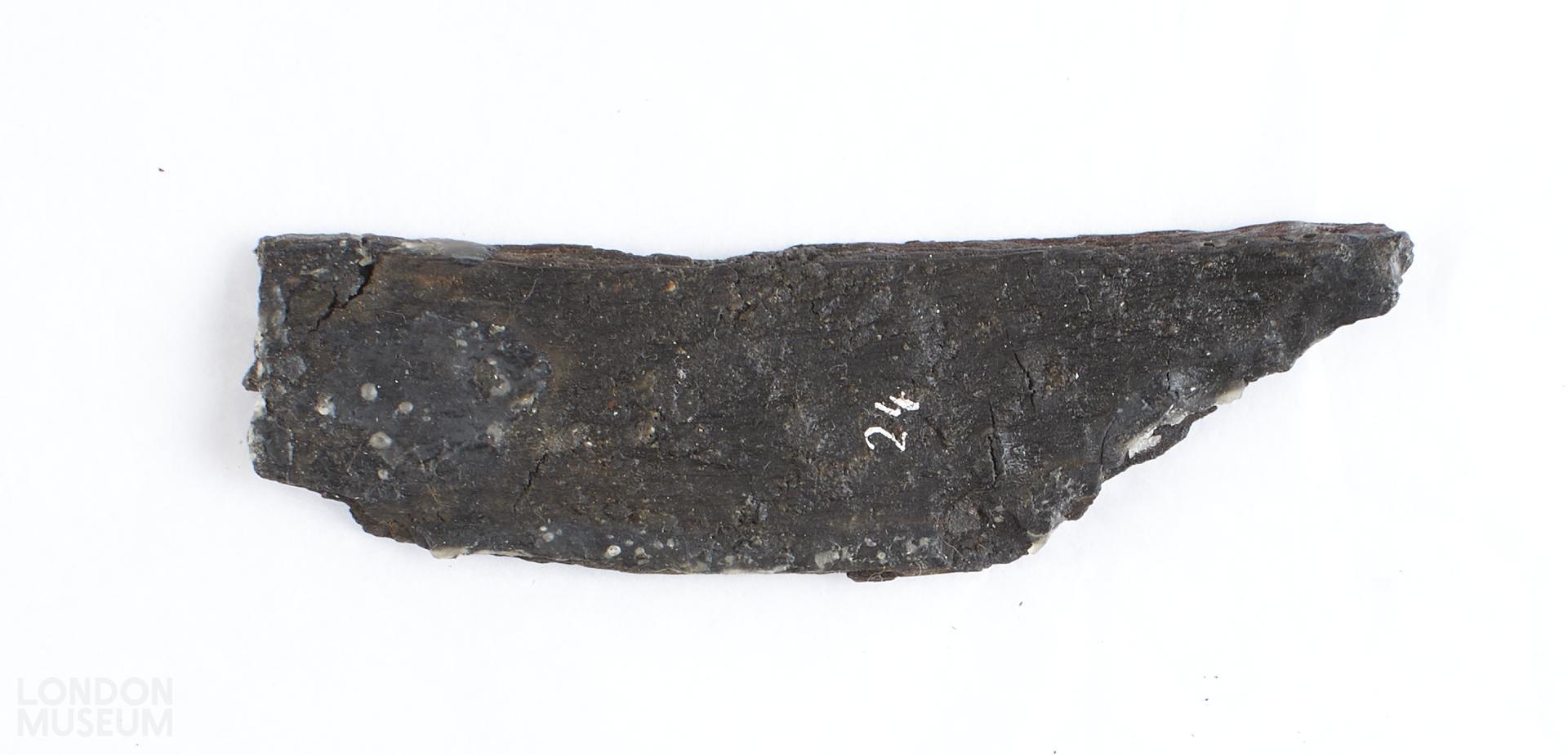 Wooden fragment from near apse of Mithras Temple. 2 side pieces with a cross-batten at top and bottom. Panelling, bearing traces of original red paint, was nailed to cross-battens.