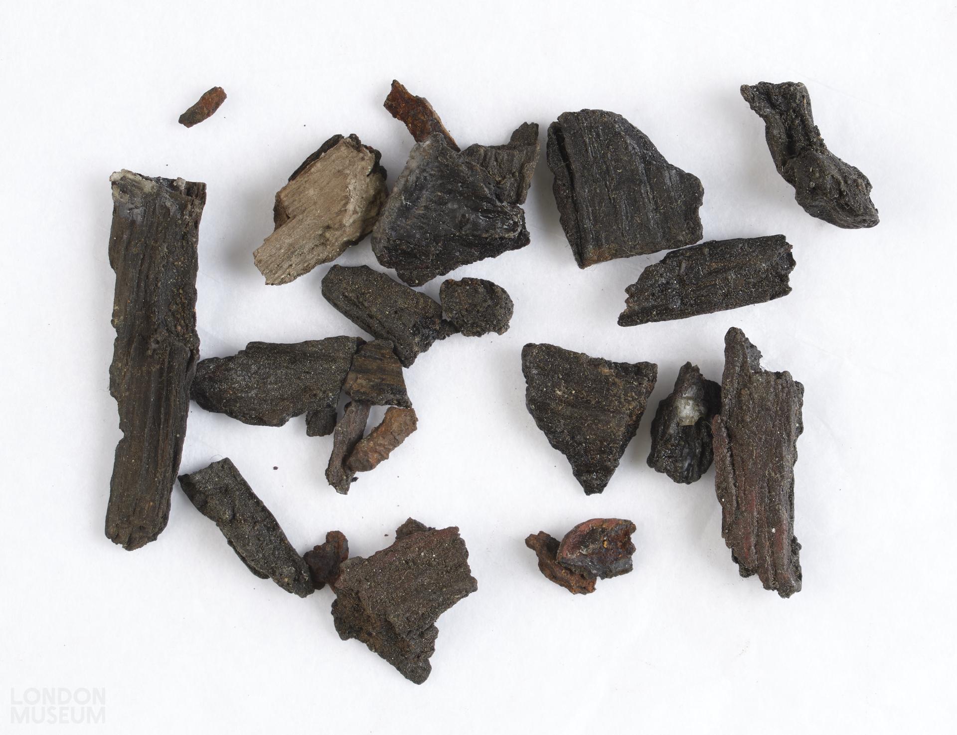 Wooden fragment from near apse of Mithras Temple. 2 side pieces with a cross-batten at top and bottom. Panelling, bearing traces of original red paint, was nailed to cross-battens.
