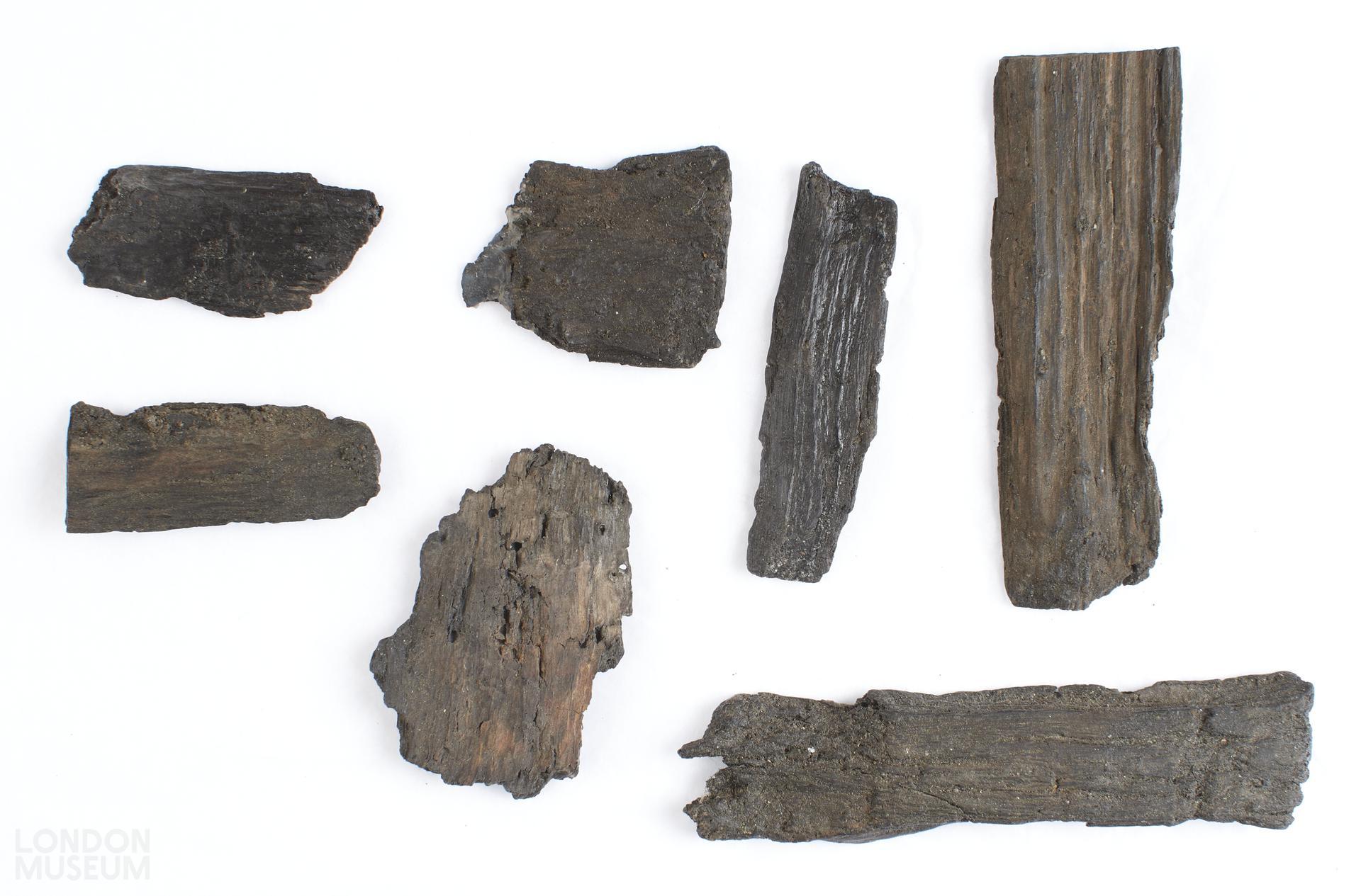 Wooden fragments found near apse of Mithras Temple. 2 side pieces with a cross-batten at top and bottom. Panelling, bearing traces of original red paint, was nailed to cross-battens.