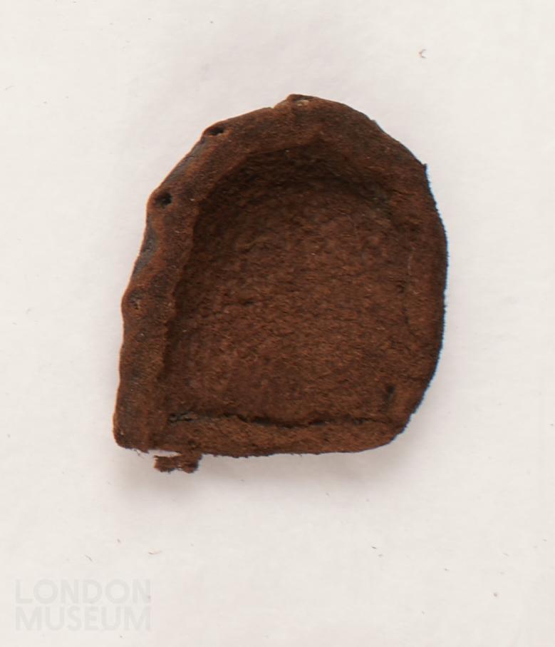Incomplete leather children's shoe sole, fragment of a shoe. Consists of the heel section only. Small holes around edge where shoe was once stitched together. Raised edge, folding inwards. Leather worn and cracked in places.