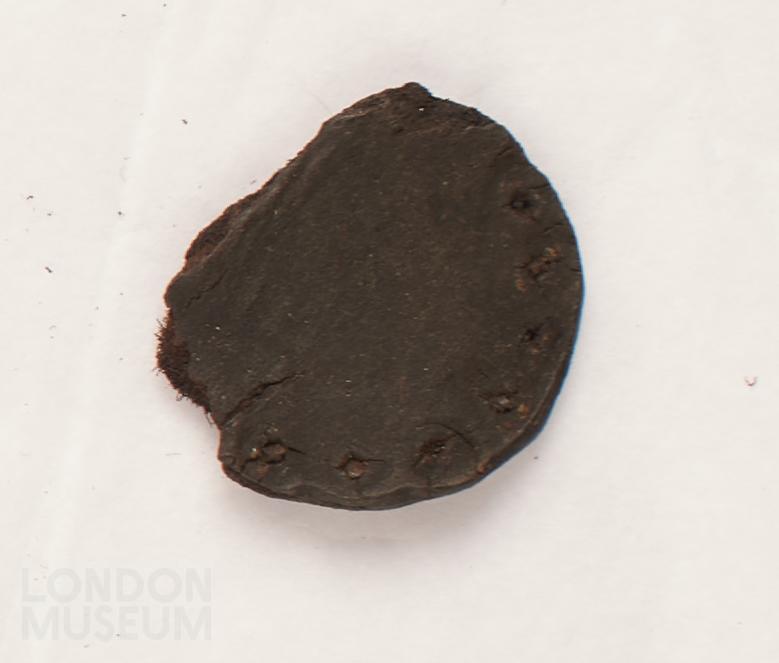Incomplete leather children's shoe sole, fragment of a shoe. Consists of a fragment of the heel section, broken off at the front. Small holes around curved border of the heel where shoe was once stitched together. Leather worn and cracked in places.