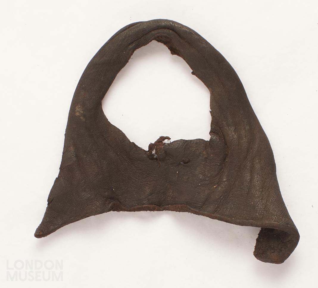 Likely a fragment from a leather shoe, found in a bag together with leather shoe fragments.