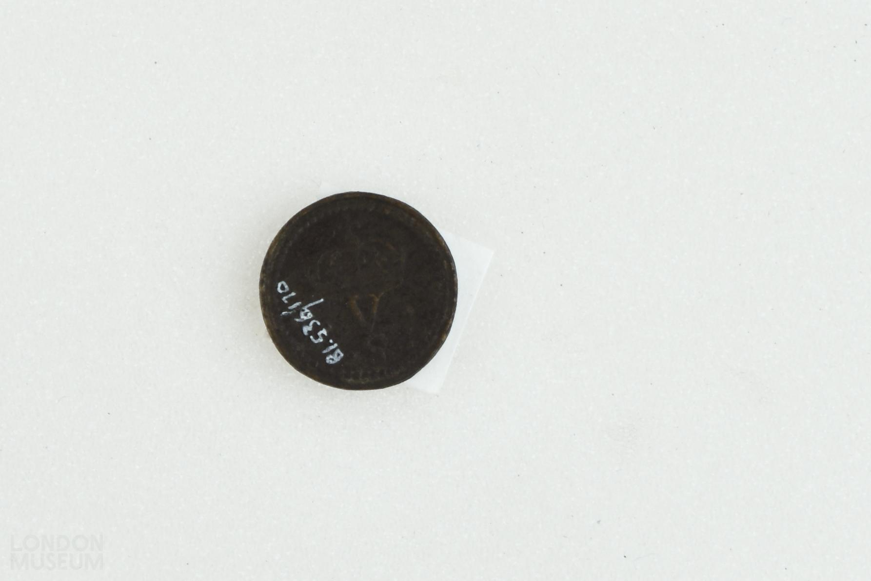Coin weight of Charles I. On the obverse, there is a side portrait of Charles I with the inscription 'CAROL REX'. On the reverse, there is a crown above a 'VS'