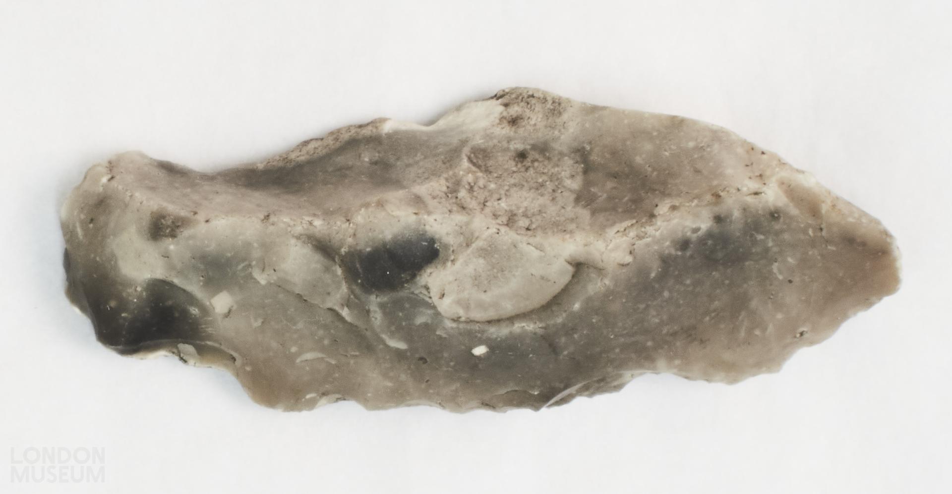 Natural flint. Grey in colour with lighter sections. Elongated in shape. Ridged on one side and flat on the other.