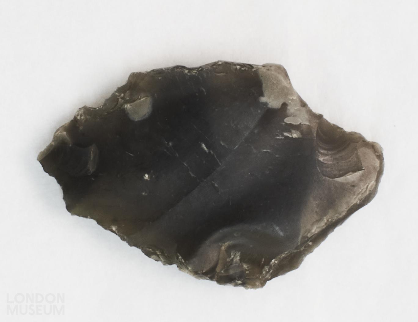 Natural flint. Dark grey in colour. Flat and irregular in shape.