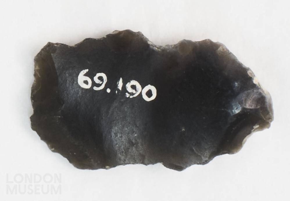 Natural flint. Dark grey on one side and white on the other. Flat and irregular in shape.