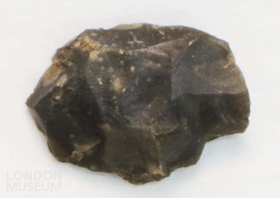 Natural flint. Dark grey with lighter specks near the edges. Flat and irregular in shape.