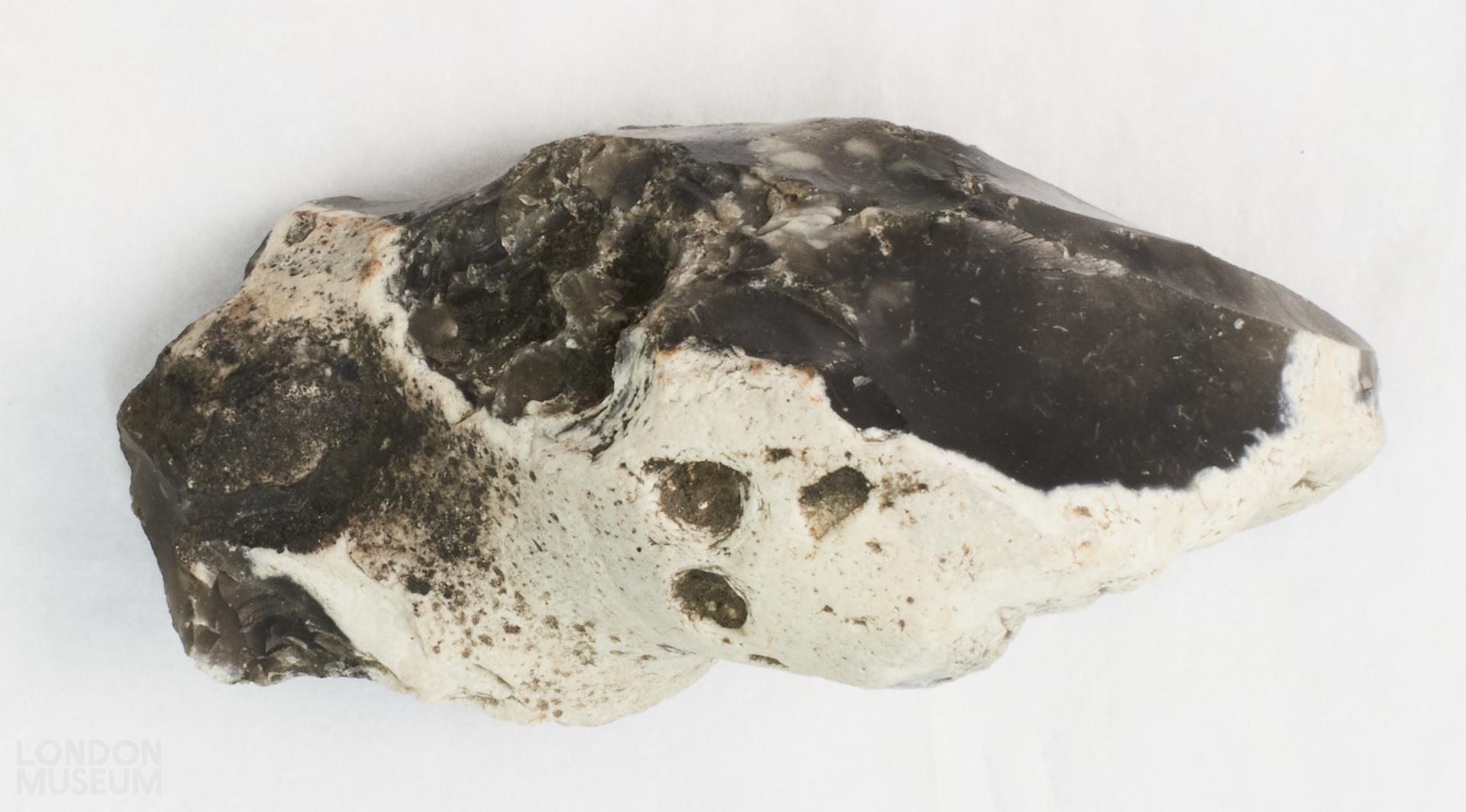 Natural flint. Grey with matt white sections. Elongated in shape with a flat side and a domed one.