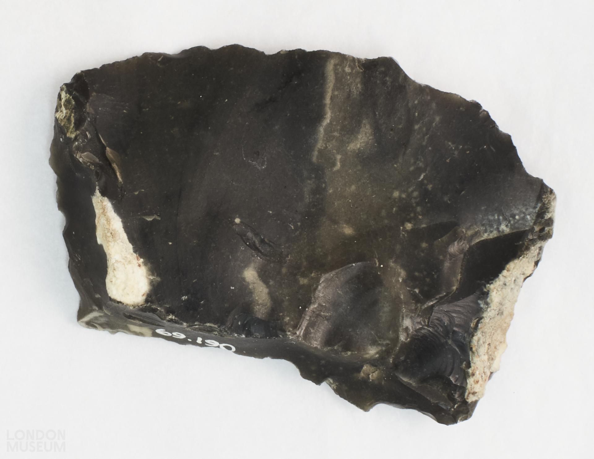 Natural flint. Dark grey in colour with two matt white sections on opposite ends. Flat in shape.