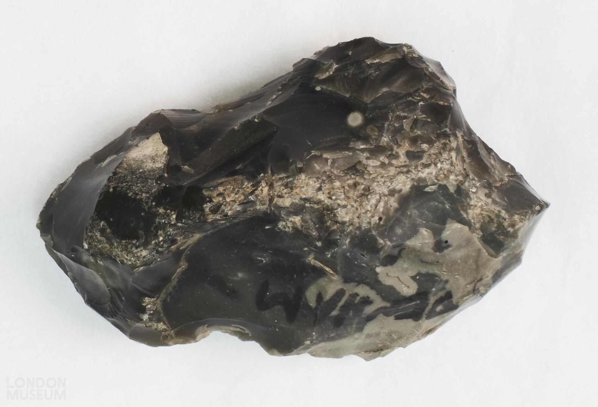 Natural flint. Dark grey with lighter areas. Flat on one side and ridged on the other.
