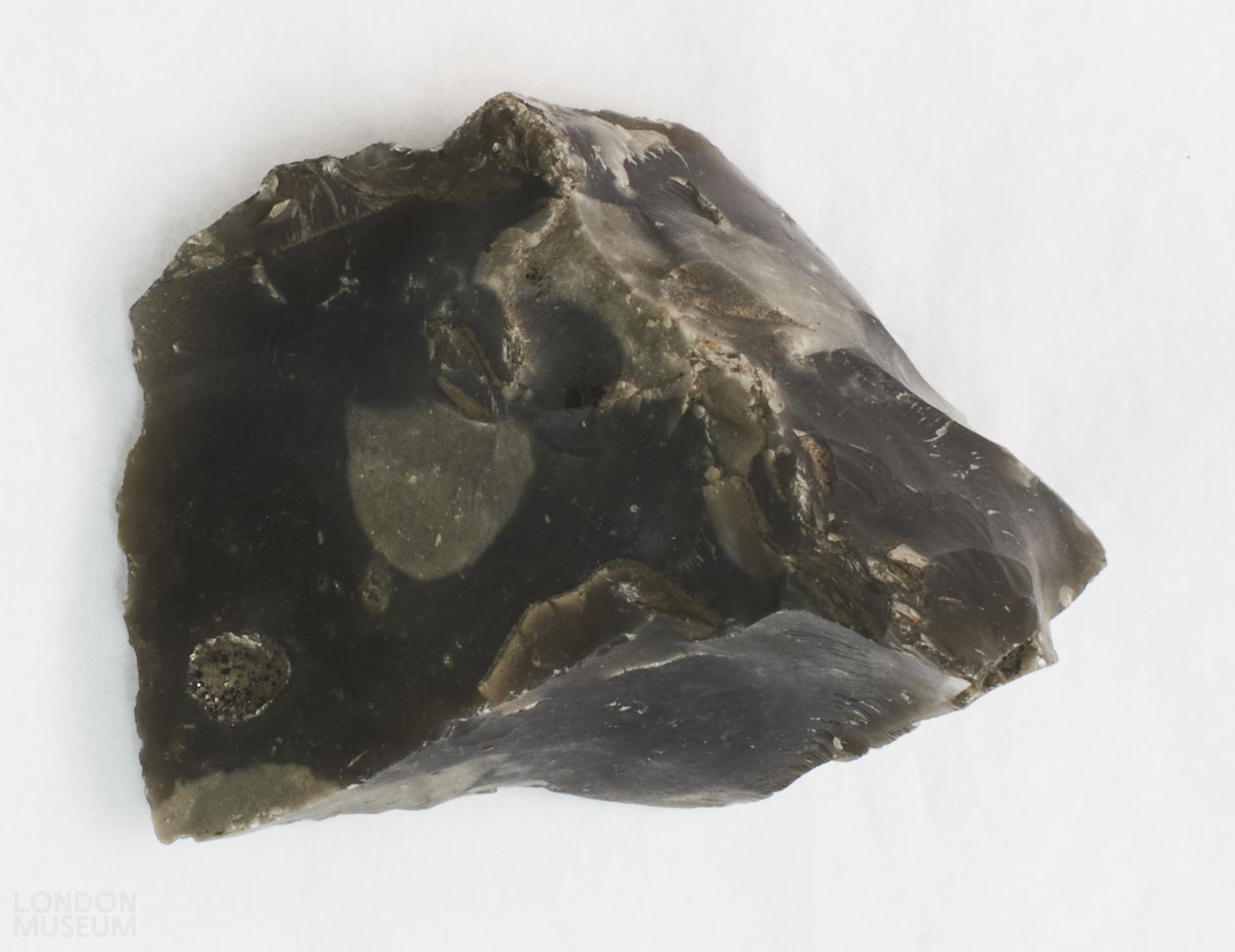 Natural flint. Dark grey with lighter areas. Flat on one side and pointed and faceted on the other.