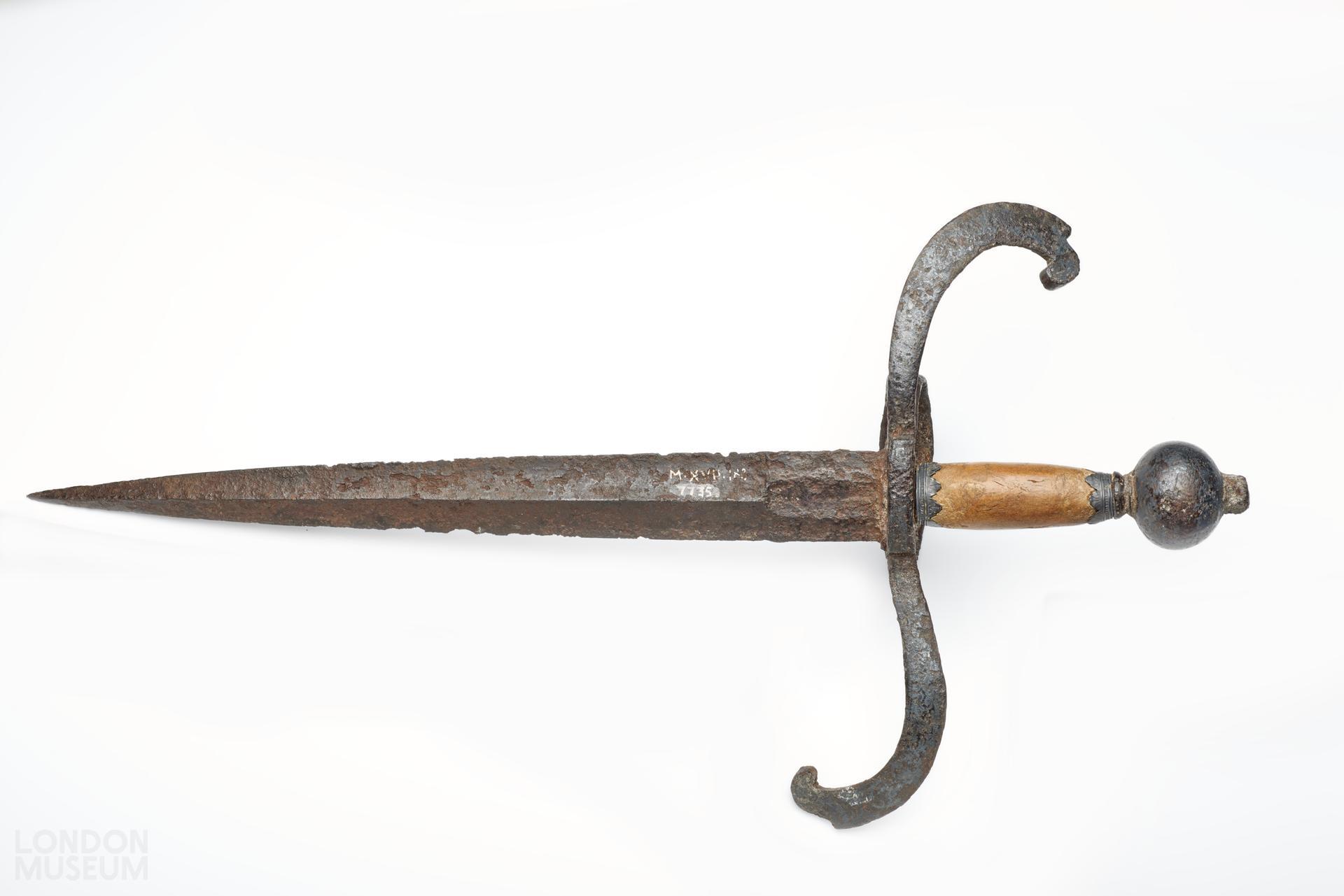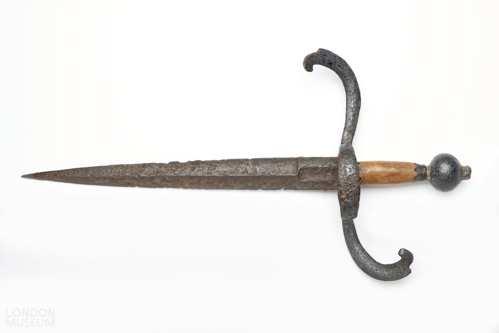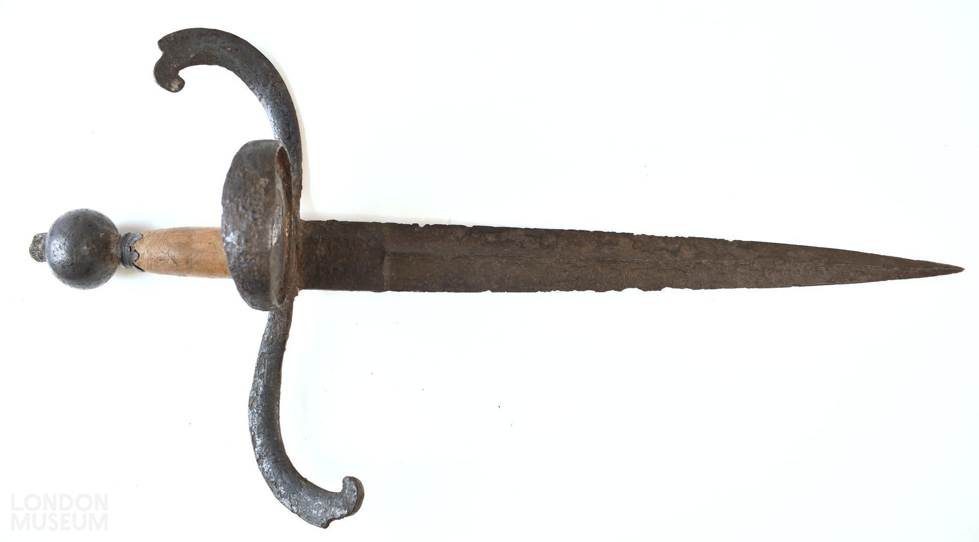 Dagger with iron blade, and decorative quillions and hand guard. It is dated to the 16th century.