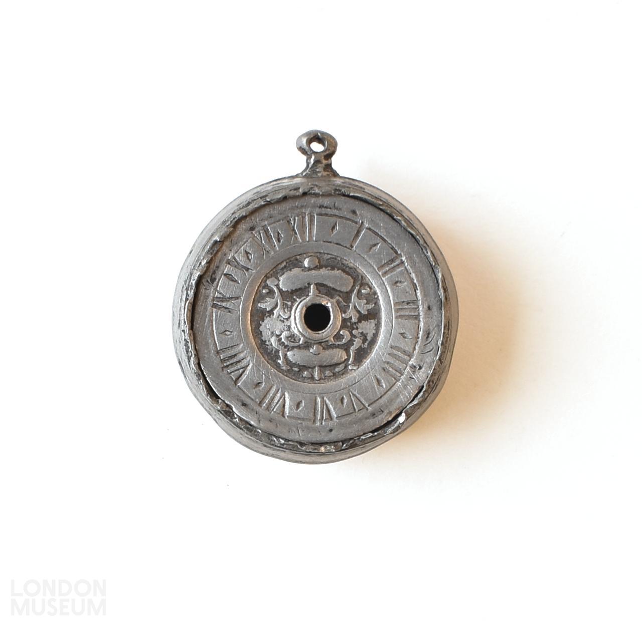 Toy watch with plain case and decorative face. Face features decorative engraving around central hole and roman numerals around edge. With suspension loop at top of case.