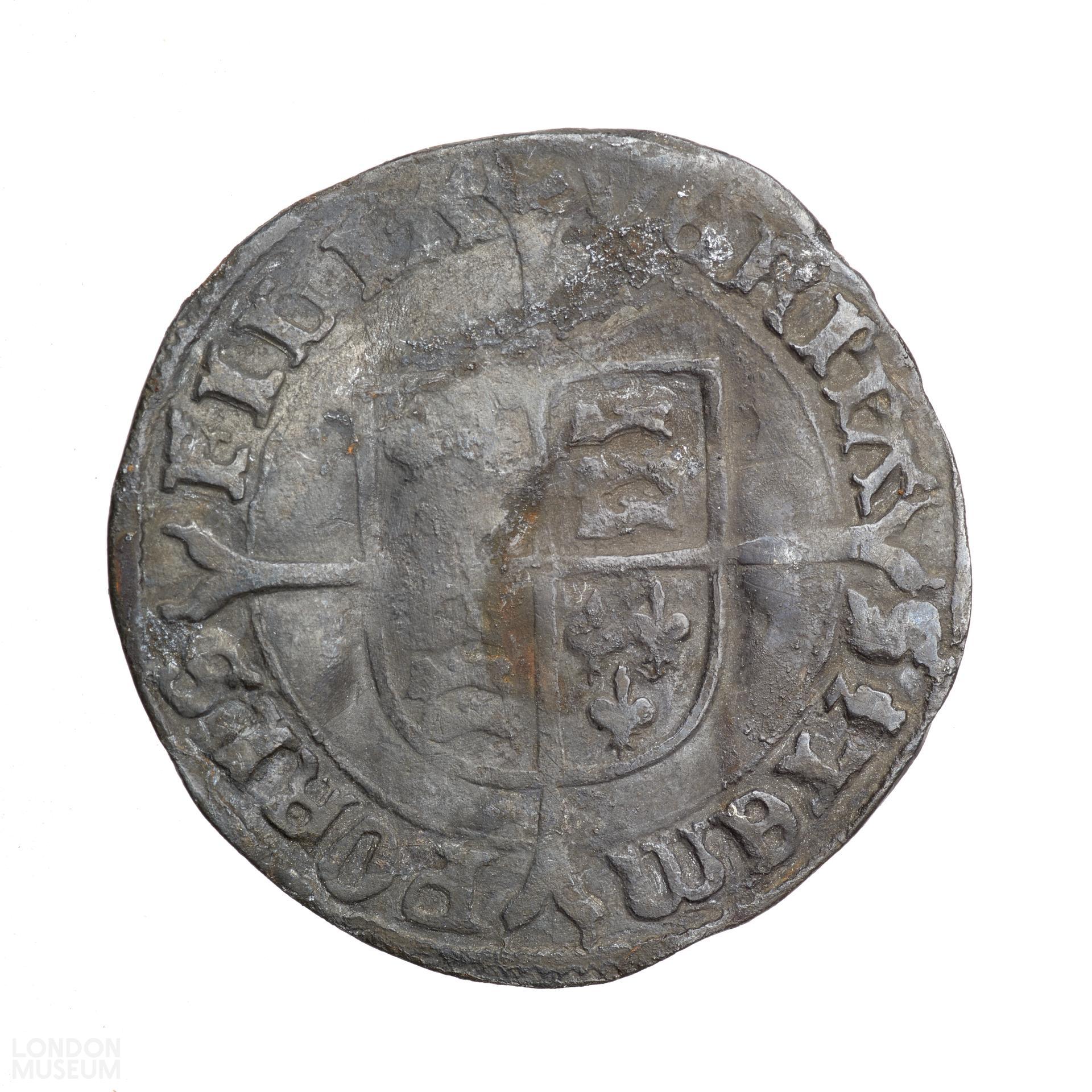 Groat of Mary I, sole reign (1553-4); mint mark a pomegranate. Found in small leather pouch with other four coins from the Thames forshore at Butler's Wharf in Southwark.
