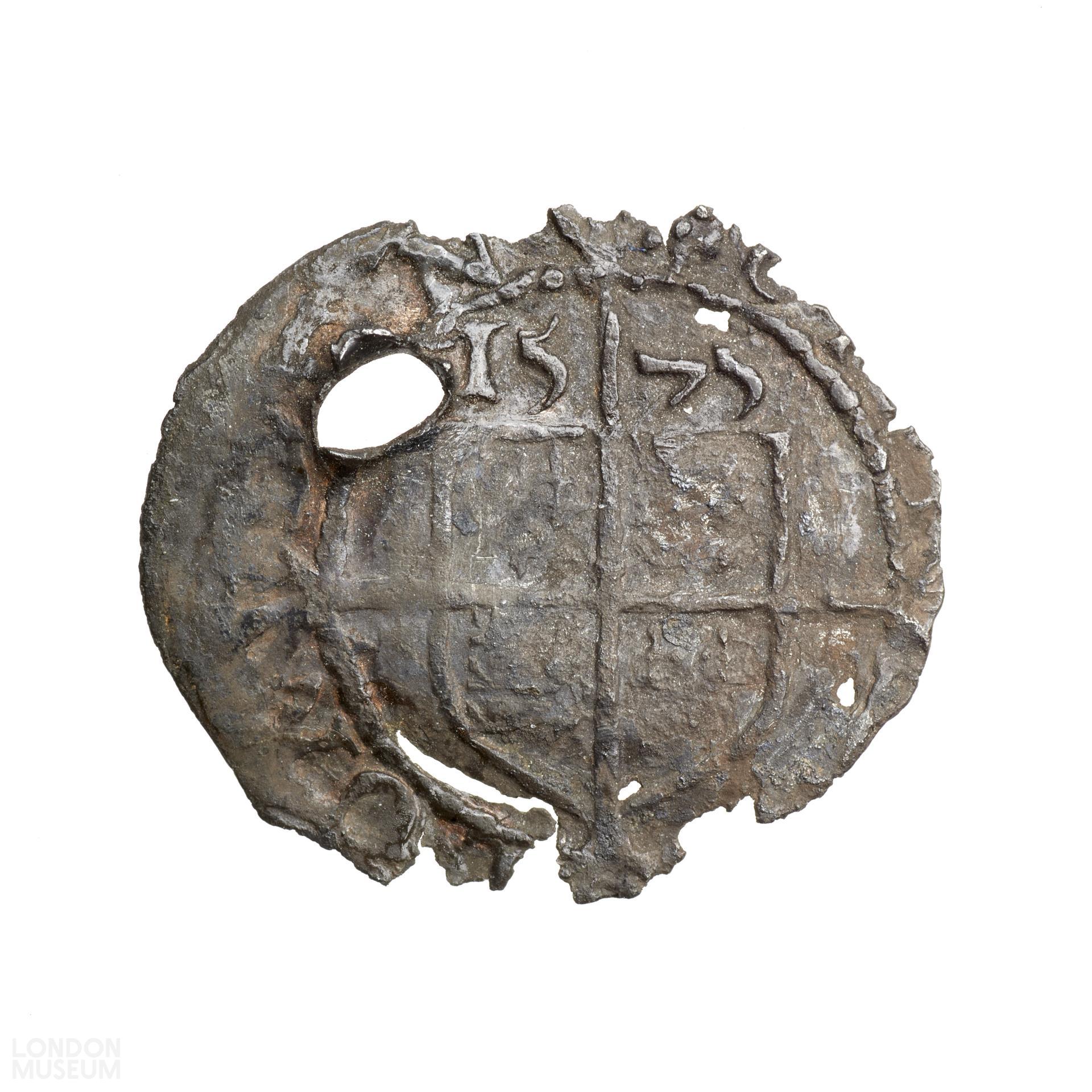 A silver three-farthing piece of Elizabeth I, third issue. The obverse showing a bust of the queen, profile to left, with the legend 'ELIZABETH D G MAG BRIT FRA HIB REGINA ('Elizabeth by Grace of God queen of Britain France and Ireland'). The reverse shows a square topped shield of the Royal Arms and cross fourchee, with the date 1577.