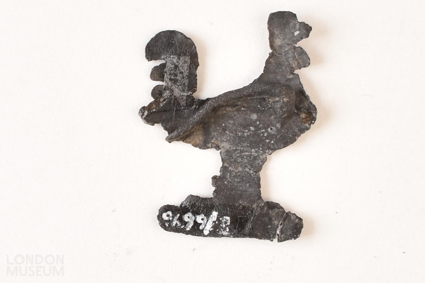 Secular badge fragment cast from tin-lead alloy (pewter) in the form of a cockrel, dated to the 15th century.