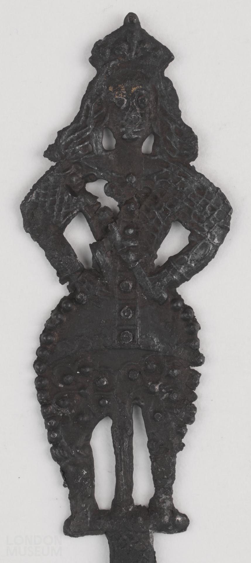 This spoon is too fragile for use, and was presumably designed as cheap souvenir to commemorate a coronation; probably Charles II ( 23rd April 1661). The earliest known full-sized functional spoons with relief-cast Royal portraits are those with the conjoined heads of William and Mary which presumbably date from their coronation in 1688. .