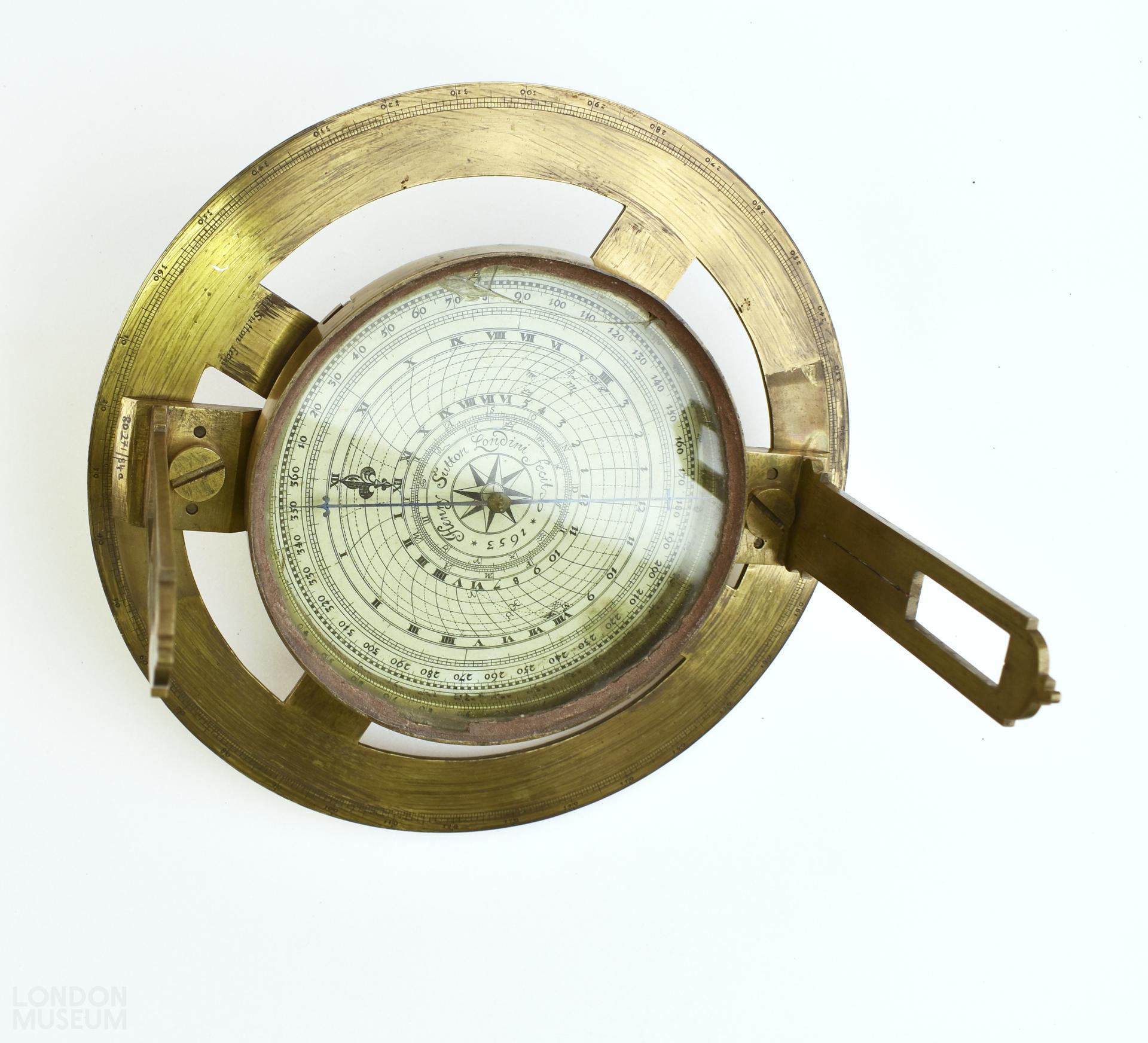 Also known as a surveyor's compass, a circumferentor is an instrument used in surveying to measure horizontal angles. .Henry Sutton (fl. 1624-1665), probably the son or nephew of Baptist Sutton, a maker of engraved scales, was a member of the Joiner's Company and a well-known engraver, publisher and instrument maker who worked in Threadneedle Street, Cornhill in the City of London throughout his career.. Sutton was bound to Thomas Brown in 1638, and received his freedom in 1647/48. He had at least eight apprentices, including the instrument maker John Marks. Sutton was particularly famed 'for his accuracy and was in demand for drawing diagrams for mathematical books. His premises were behind the Royal Exchange, in Threadneedle Street, where he sold mathematical books as well as insctruments. Here too he observed a lunar eclipse...in August 1663. Among his workmen were Samuel Knibb and John Marks, the latter, according to John Collins, taking over his house when he died, (though he is not known at the Threadneedle Street addresss). Sutton died in 1665. His A Description and Use of a Large Quadrant was posthumously published in 1669. Other books for which he is know to have made engravings are John Collins, The Sector on a Quadrant.; A Treatise containing the Description of Three Separate Quadrants...of great use to seamen (London, 1688), John Collins, Geometricall Dyalling (London, 1659) and Navigation by the Mariners Plain Seale new plan'd; or Treatige of Geometircal and Artithmetical Navigation etc. (London, 1659) and Joh Brown, The Description and Use of a Joynt-Rule (London, 1661). Dated instruments signed by Henry Sutton, sold at auction and in public collections range from 1637 to 1669 (some evidently posthumous products). The magnetic azimuth dial in the museum's circumferentor served Sutton as a trade card. See also, a surveyor's quadrant illustrated in The Field, for October 1938, p.933. The prestige of Sutton's scale division was such that even a century after his death his name was still used as a guarantee of quality