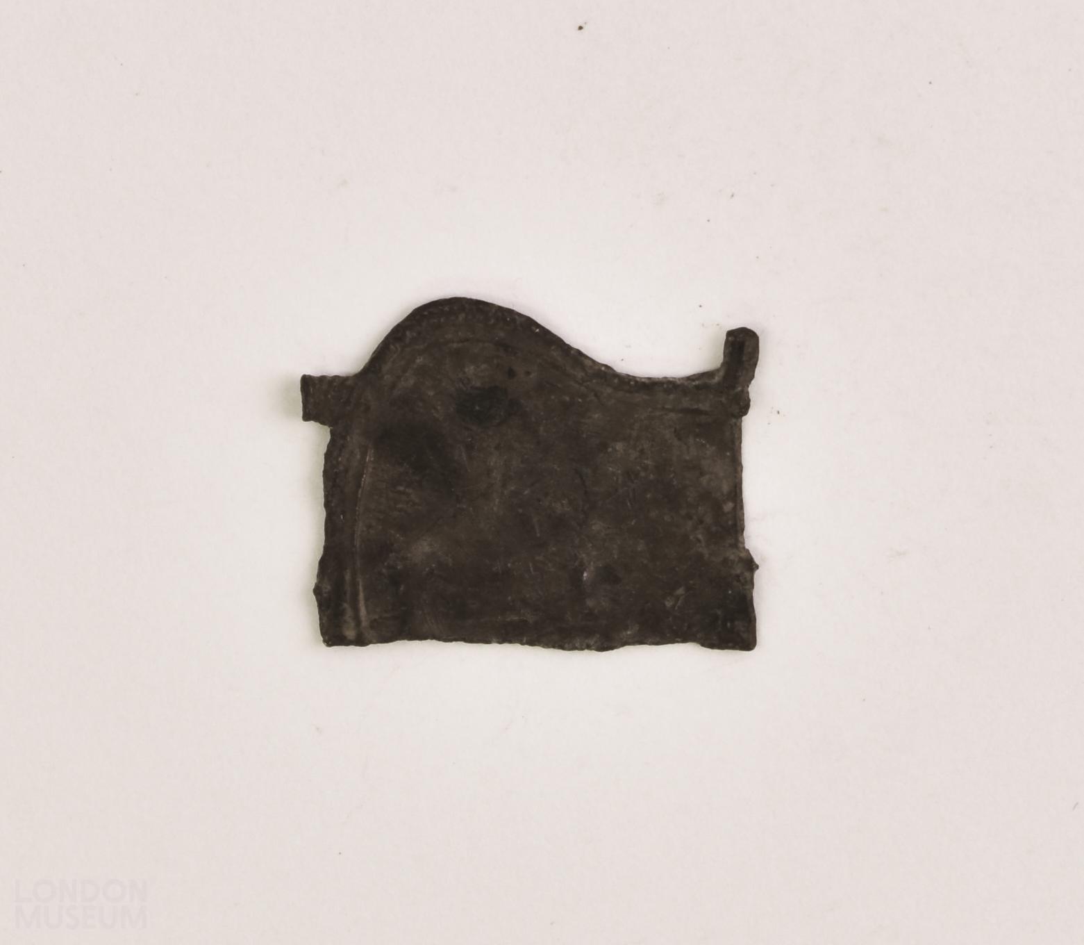 Perhaps from a piece of toy furniture. Fragment, solid, plain with incised edges and two tabs. Plain reverse.