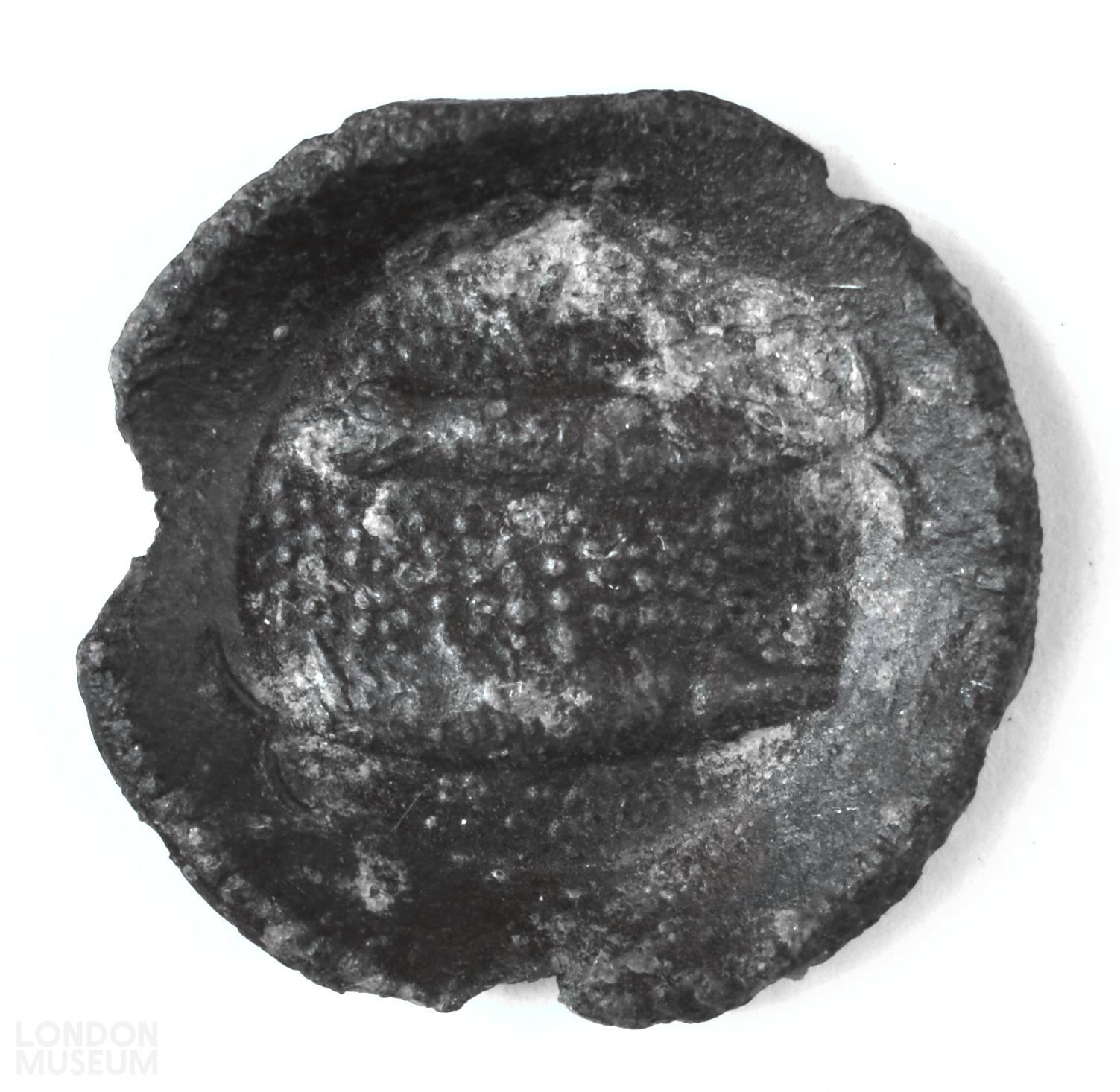 The pan from a long handled frying pan with two fish (head to tail) and stippled background. Beaded rim.