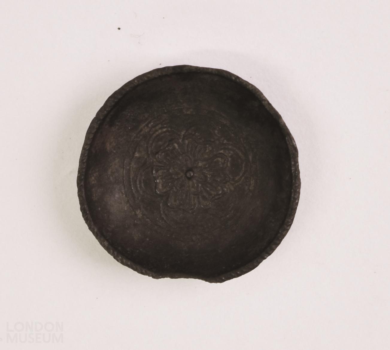 A toy porringer bowl? with small damage to the rim. The bowl is decorated with a floral roundel. Hatched rim. Smooth and plain bottom.