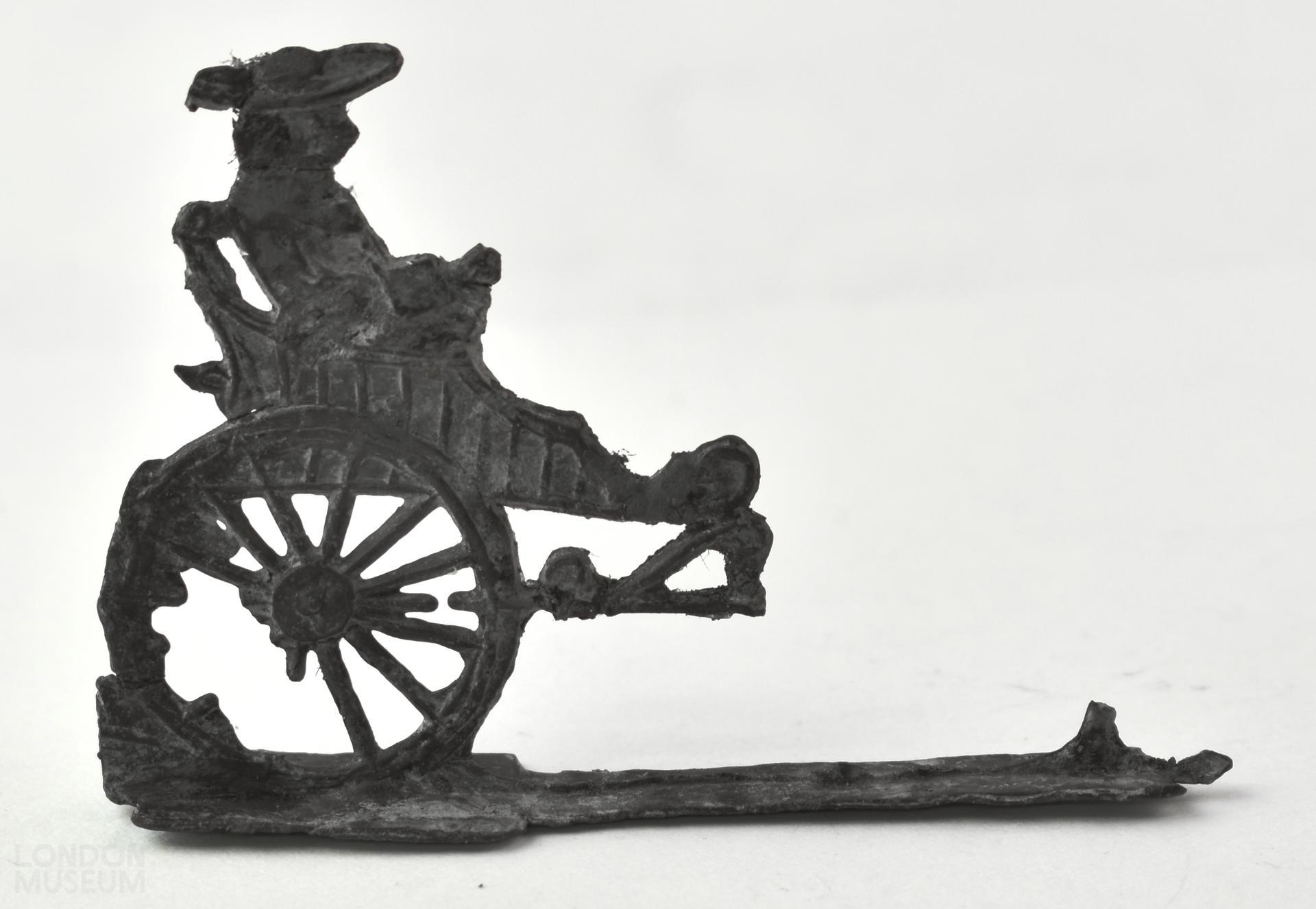 Male figure, profile to right, in chaise with part of stand. Shaft and some of the wheel spokes missing. Flat, with plain back. Heavily weathered.