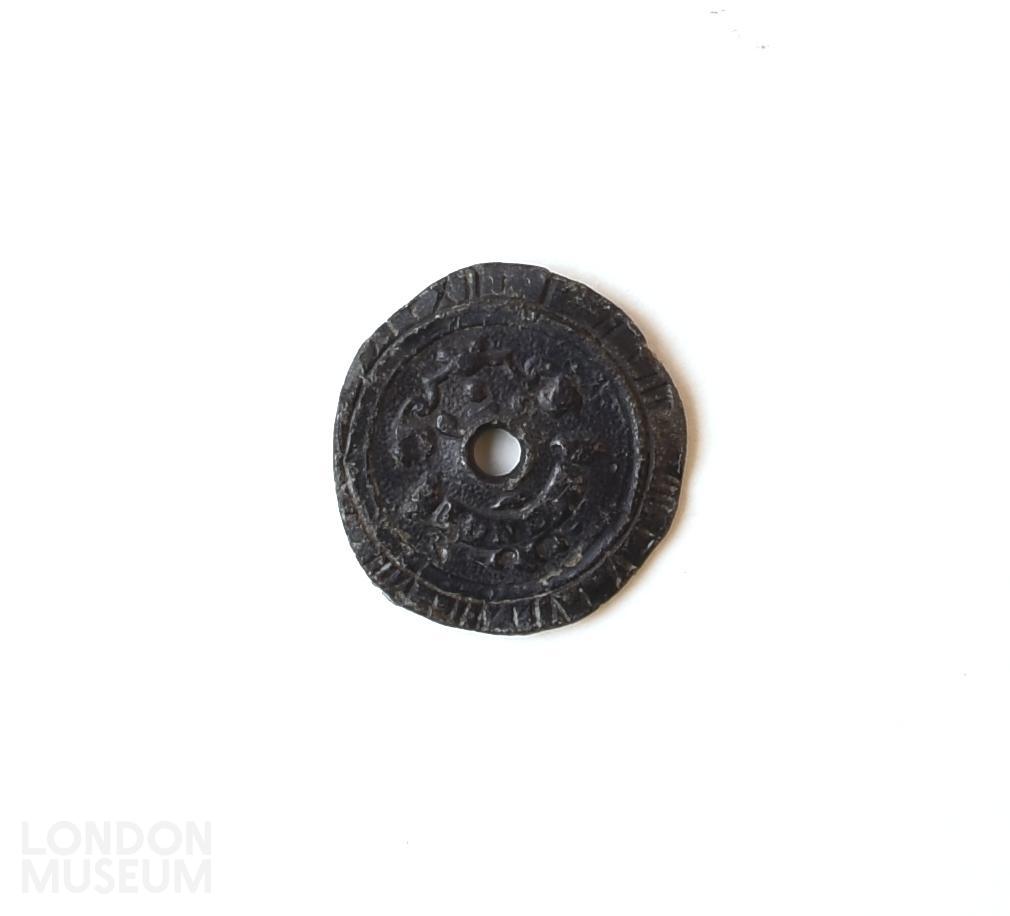 Metal toy watch made from lead alloy. Two part, dial only. Roman hour numerals I - XII with dots between to indicate the half hour. Circle. Swag and cartouche inscribed LONDON. Central hole for pin and hand (missing).