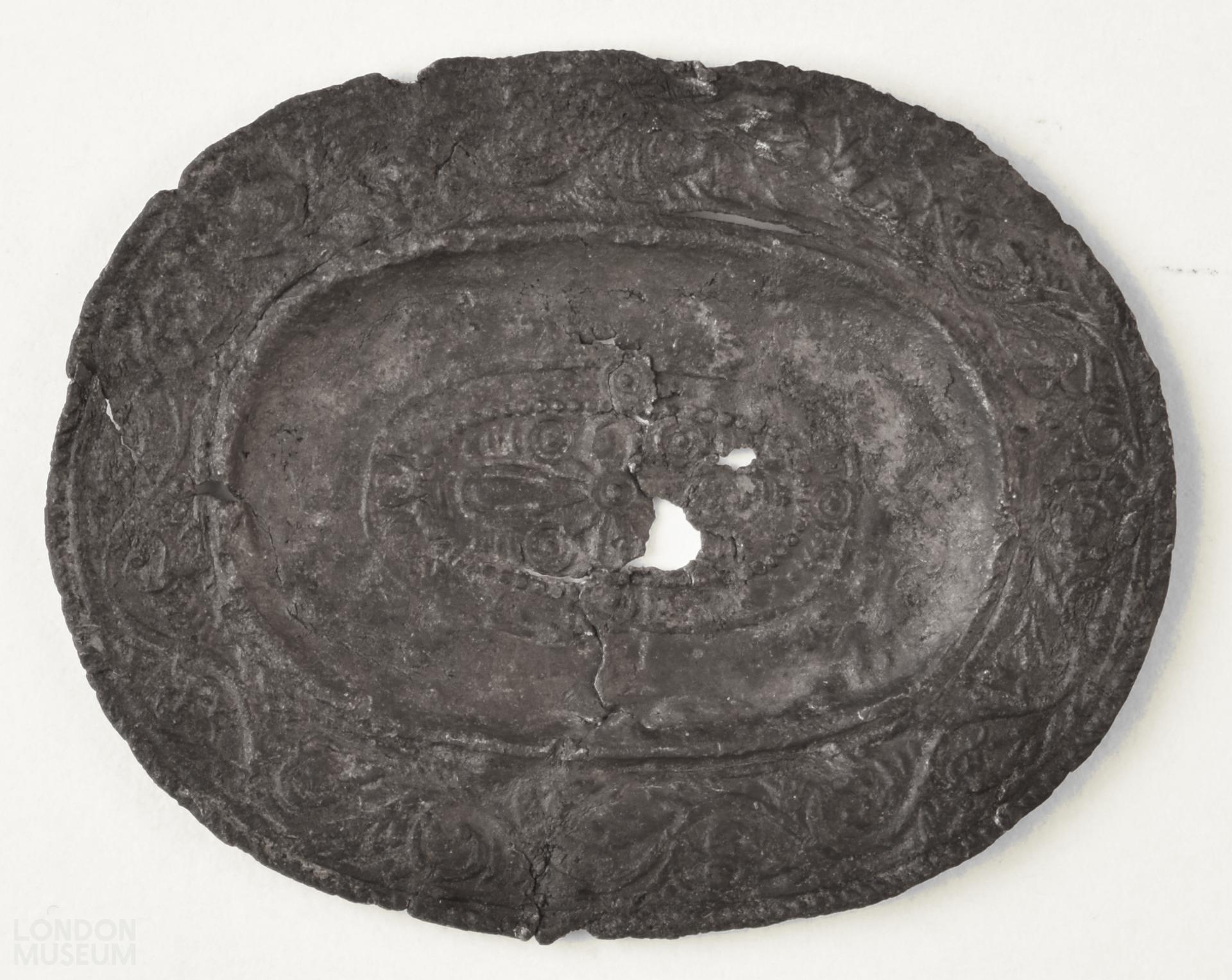 An oval dish with central geometric design within a beaded decorative frame. The wide rim flange has a foliate design with an oval cartouche containing the initials IQ. Beaded rim. Minor damage with small hole in the centre.
