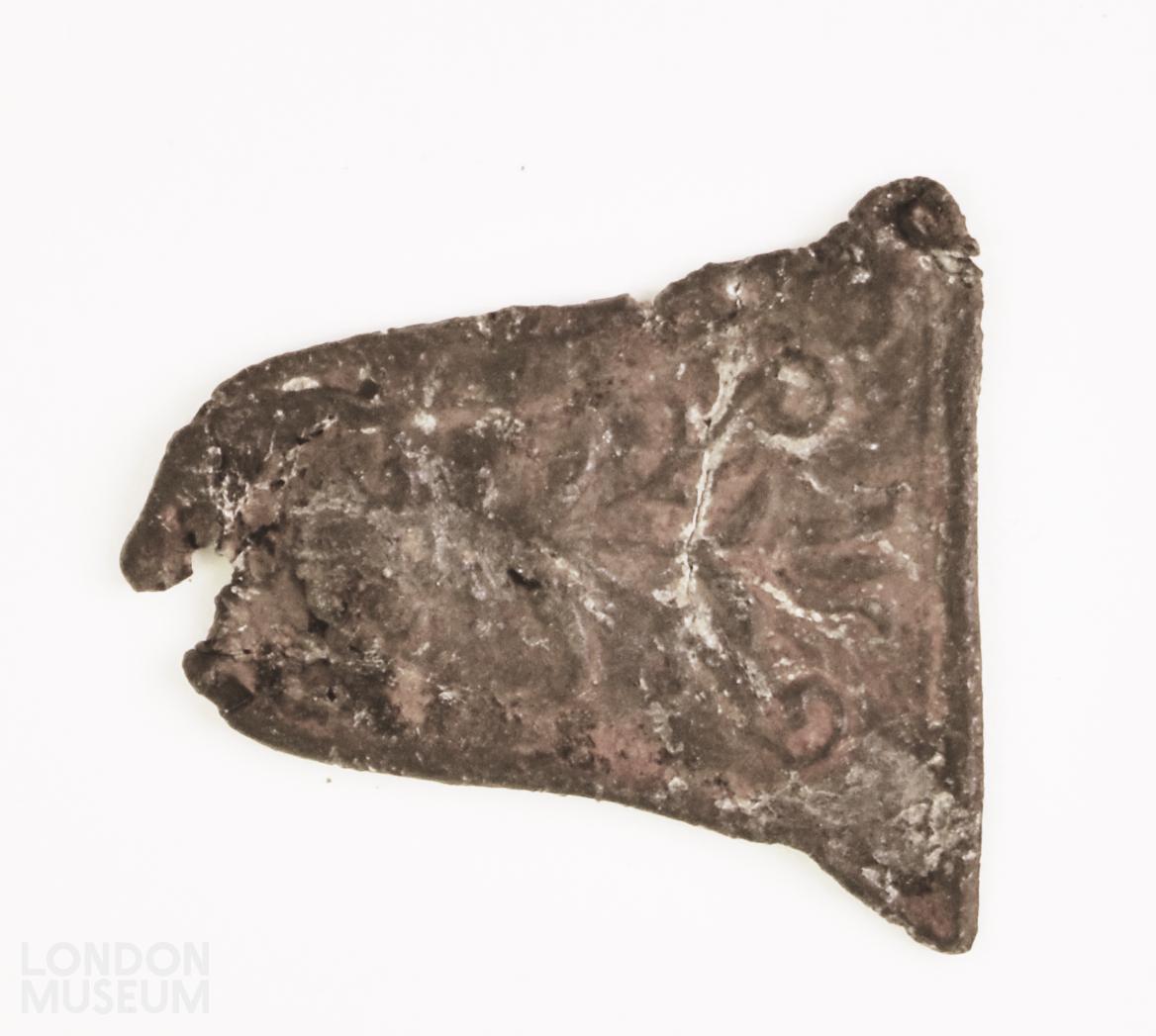 Shovel only. Plain edge, foliate/floral ? decoration. Very worn.
