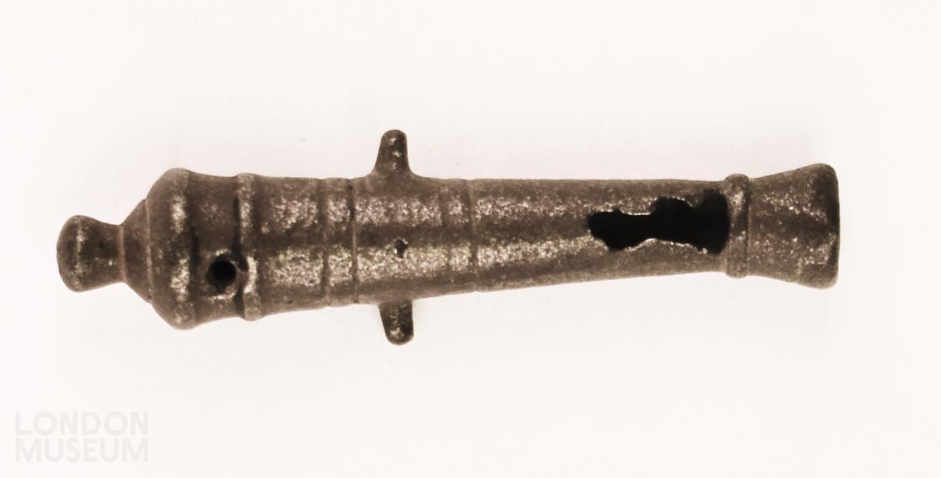 Toy cannon cast in one piece with tapering barrel, flaring at the muzzle. Small bore with two 'reinforce' relief mouldings, and six incised grooves along the barrel. The barrel has exploded in firing. Small touch-hole within two raised mouldings. Small narrow trunnions. Tapering at the breech to the plain cascobel button.