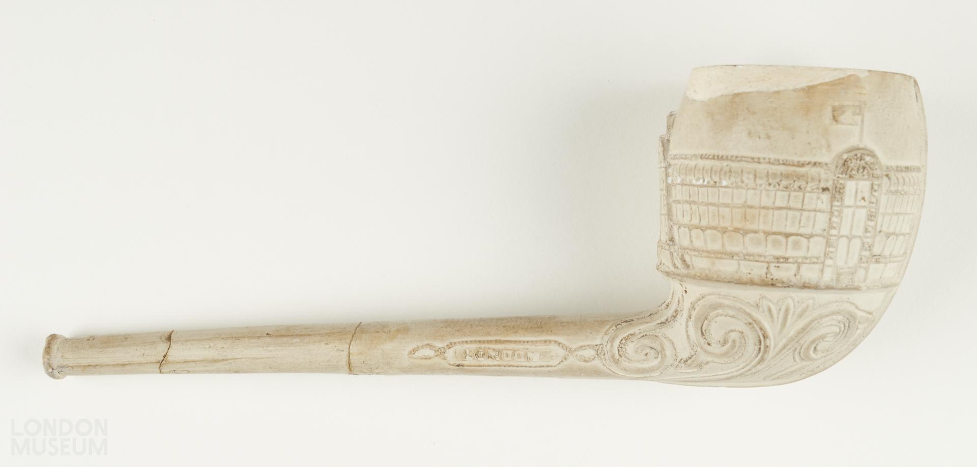 Clay pipe with large bowl bearing relief representation of Crystal Palace, stamped on stem on one side 'W.T.Blake' and on other, 'London'.