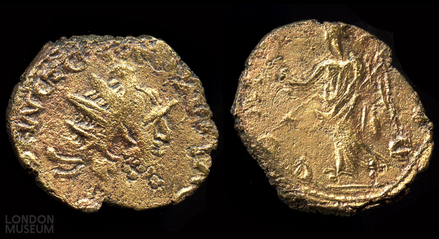 Obv: Radiate head, facing right. Obv inscription: ...WCTC... . Rev: Concorida, standing left, holding a patera in her right hand and a cornucopia in the left. Rev inscription: CON... . Part of a hoard from Newgate Street, City of London.