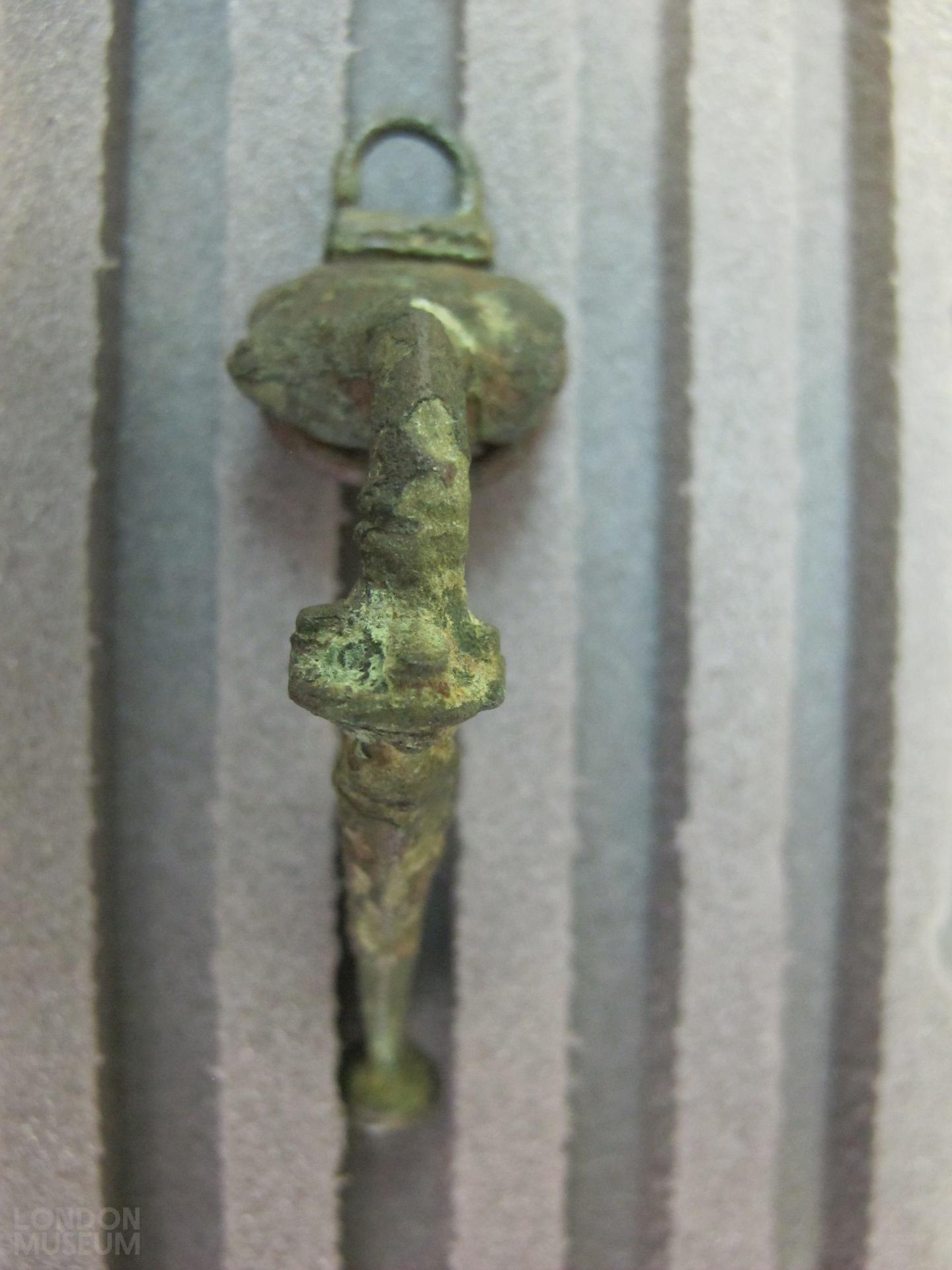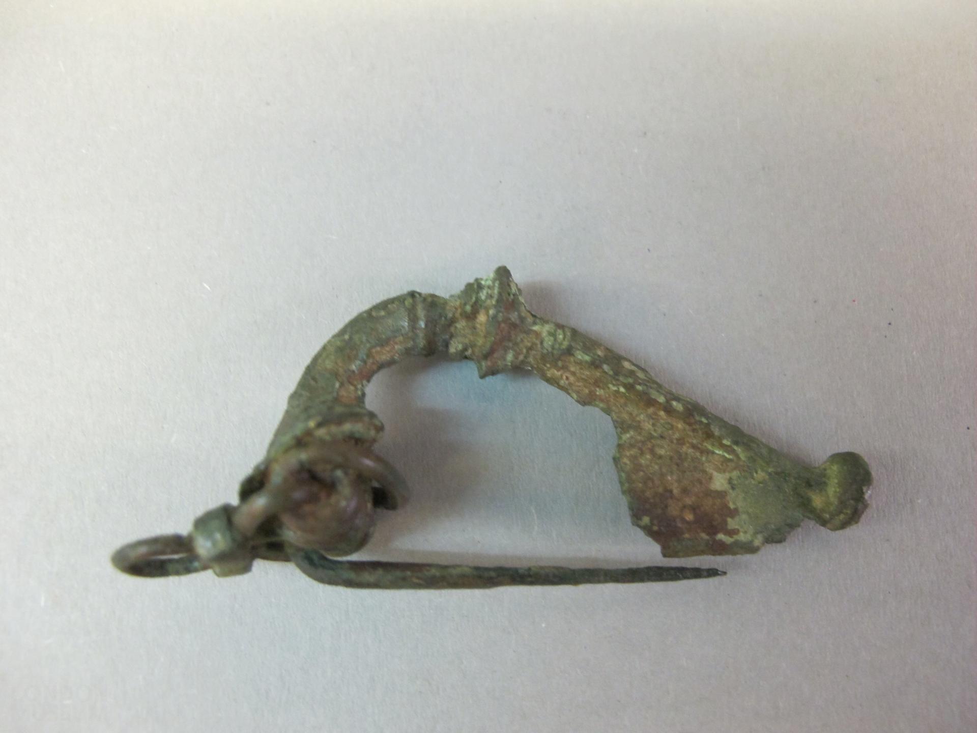 Brooch of copper alloy. Spring pin with 4 turns on one wing, 2 on other. Bronze loop with collar; bow has central acanthus moulding and ends in pedestal foot. Catchplate very corroded.