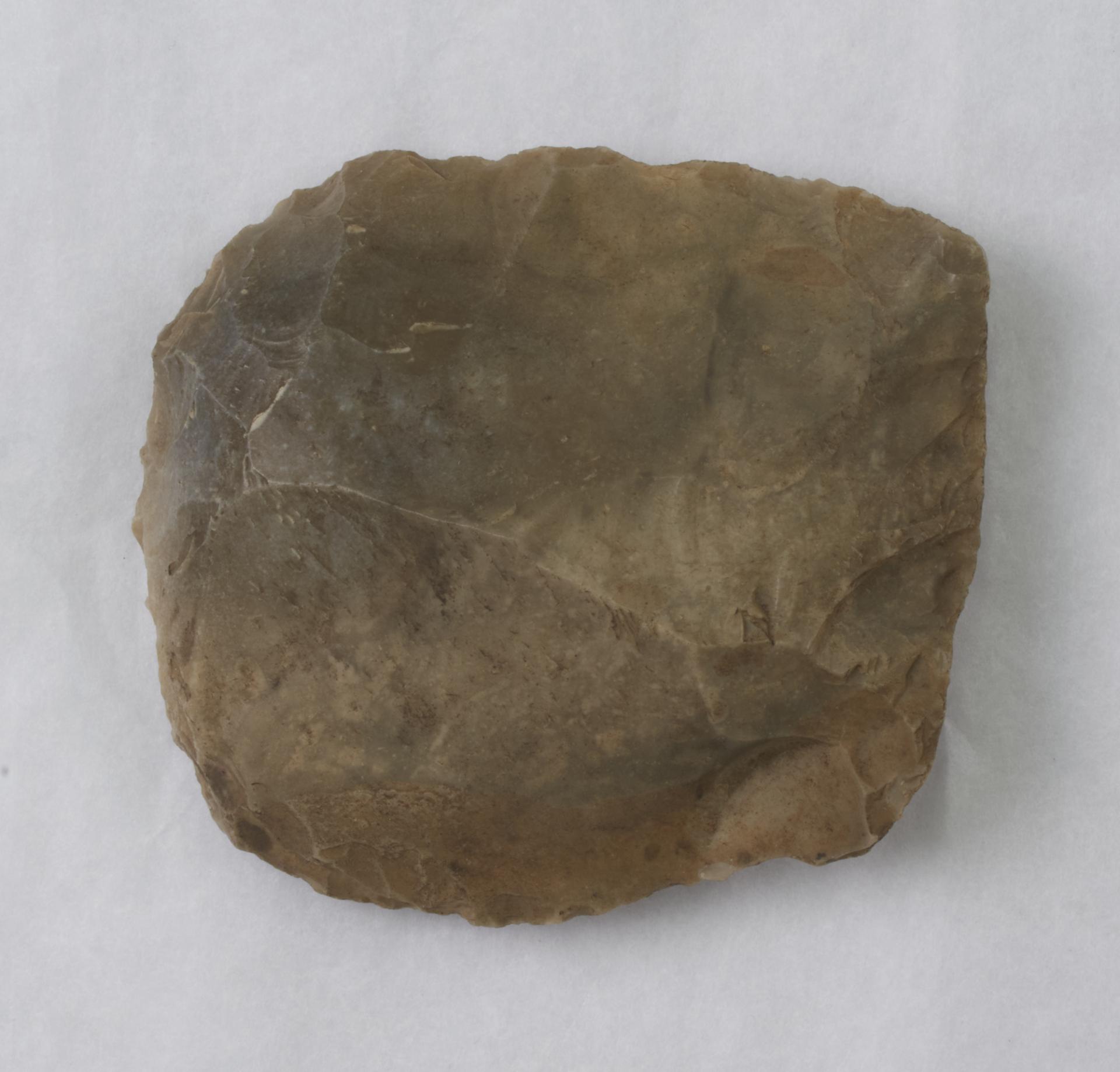 Arch-shaped flint scraper, smooth at the base. Retouched around all edges with central ridge. Brown colour.