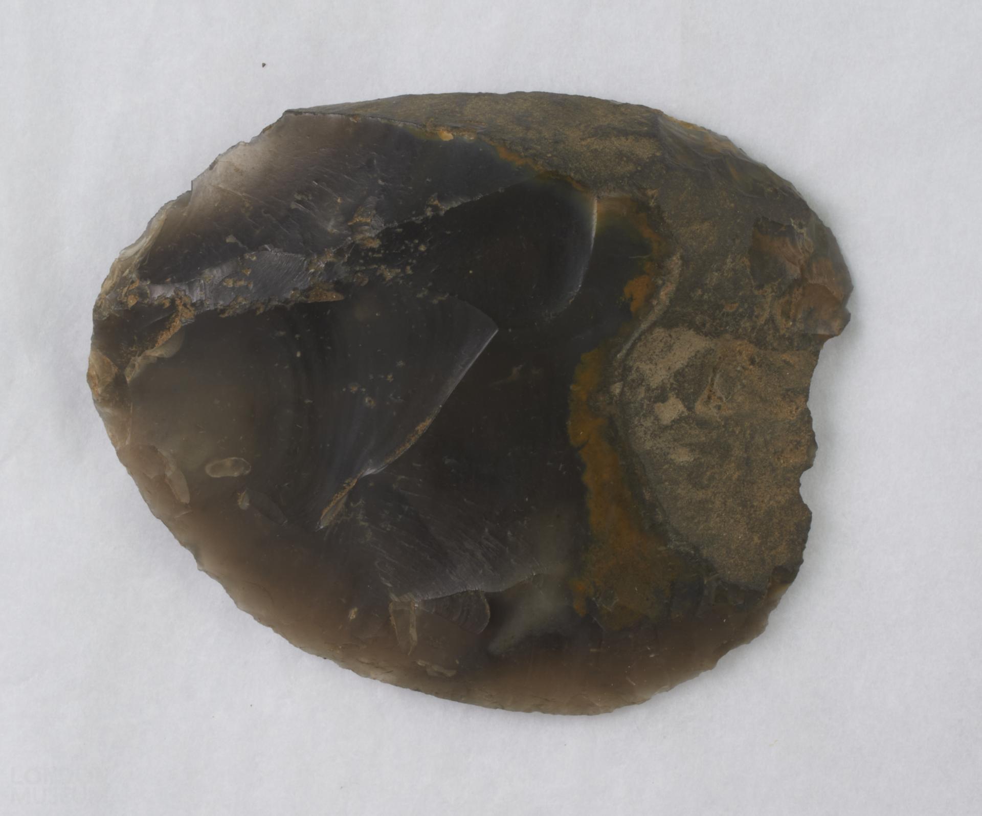 Round scraper of dark grey flint with a sharp edge showing some pressure flaking.