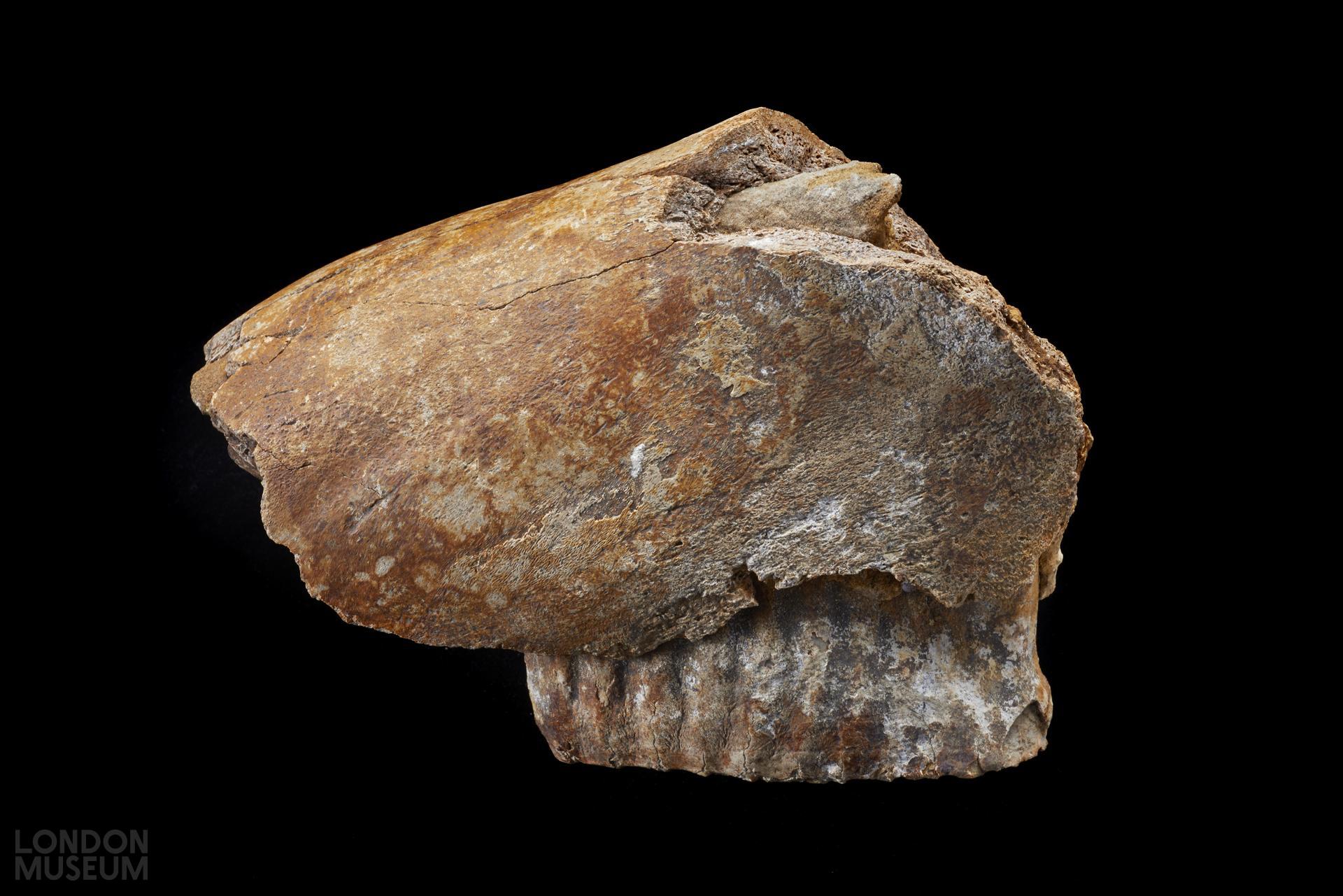 Part of a mammoth's jaw with a milk tooth in position. From the Pleistocene period.