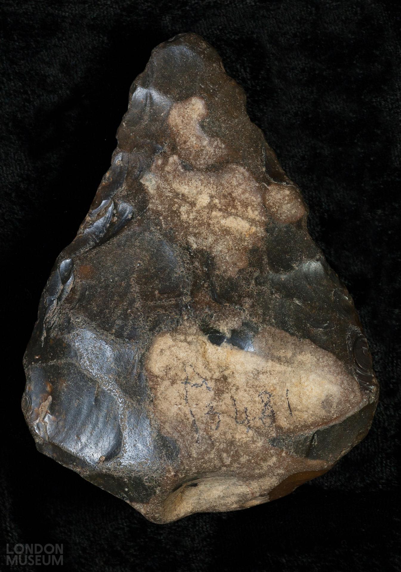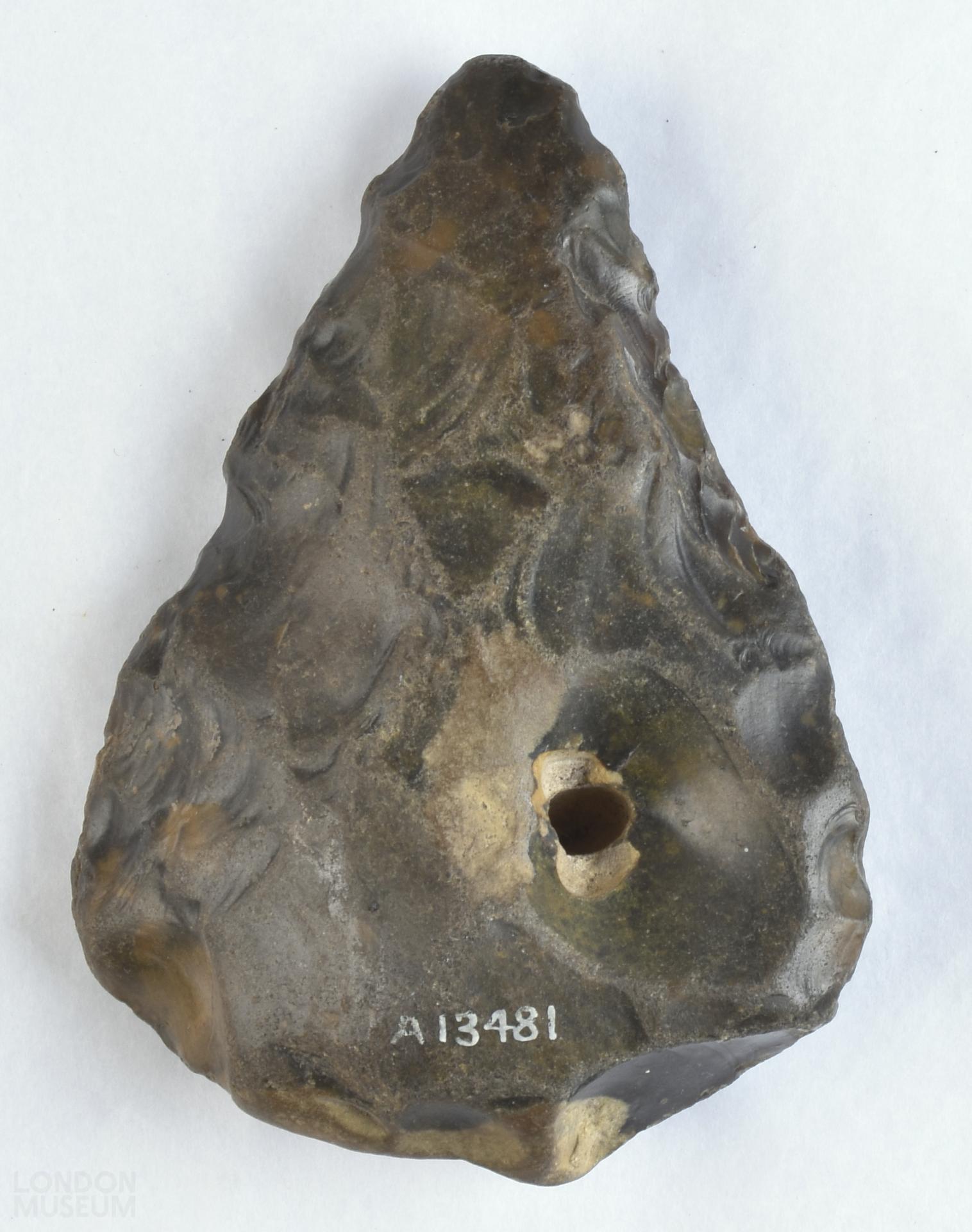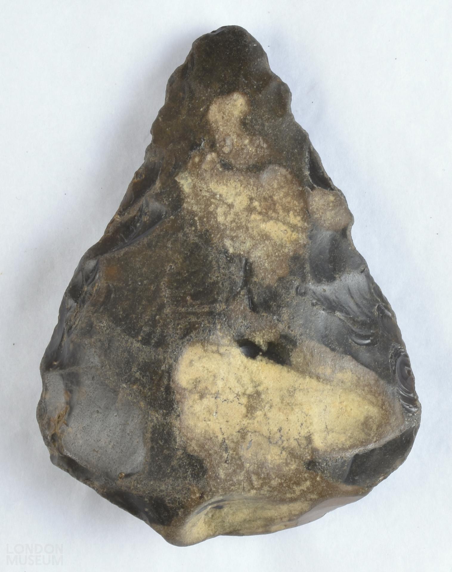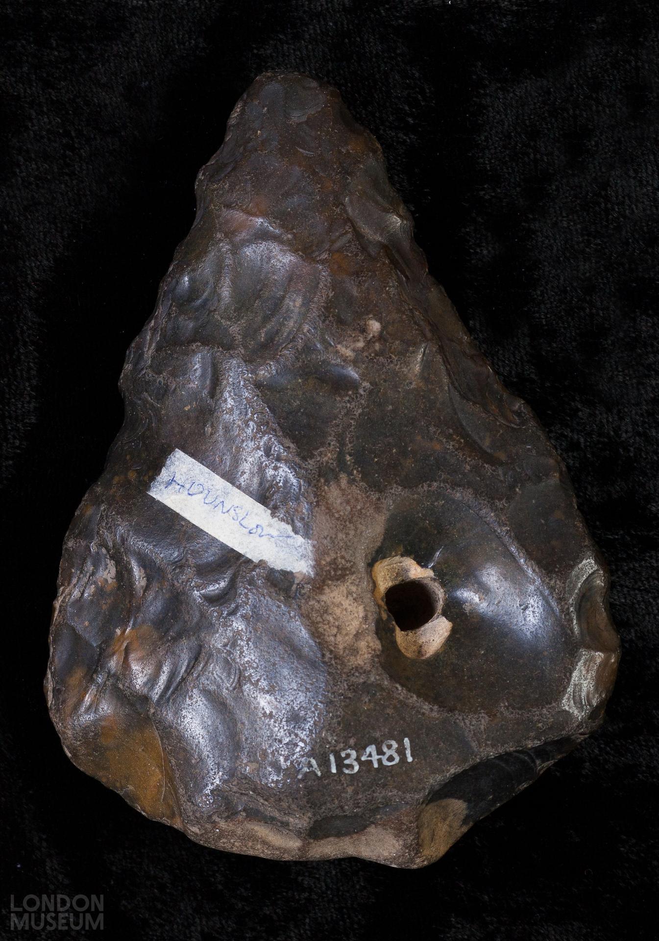 Pointed handaxe of bifacially worked very rolled dark grey flint with a hole (fossil?) on one side.