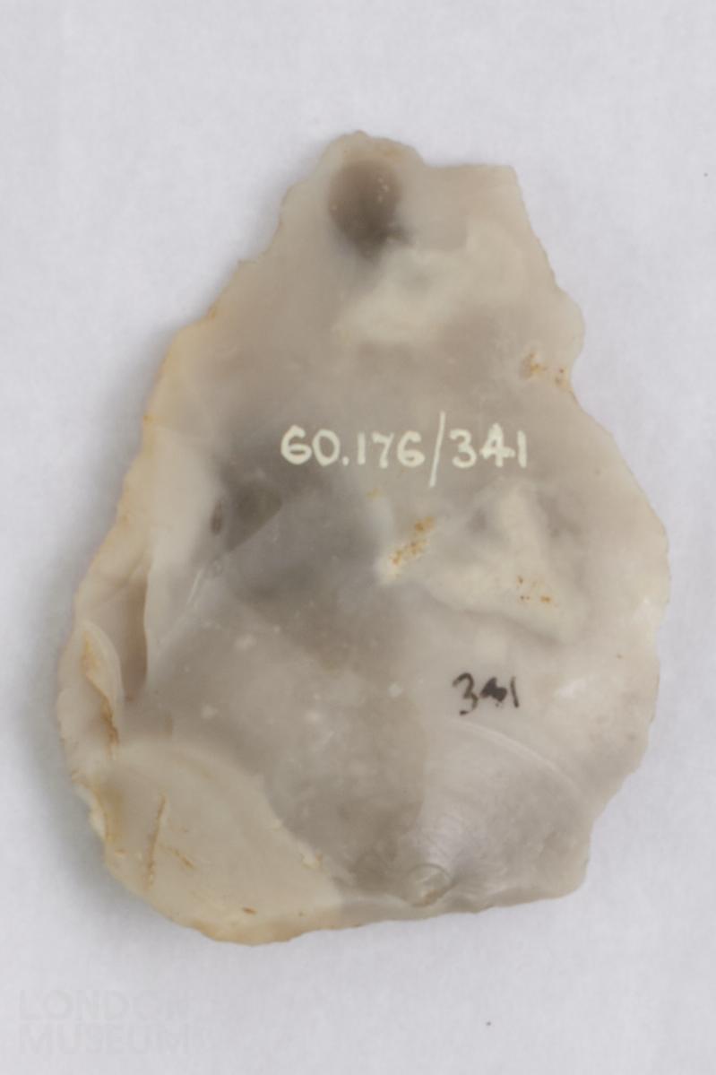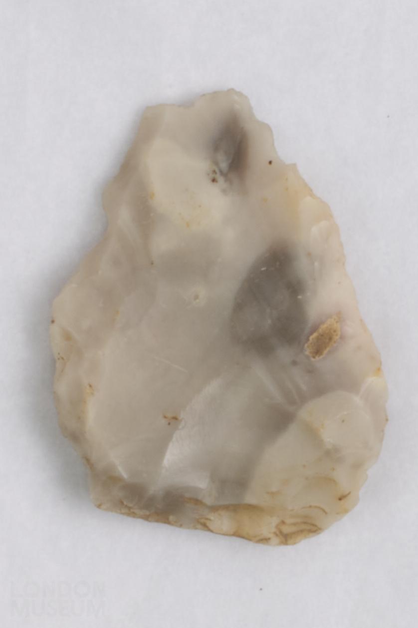 Flint leaf arrowhead. Grey and off-white in colour.