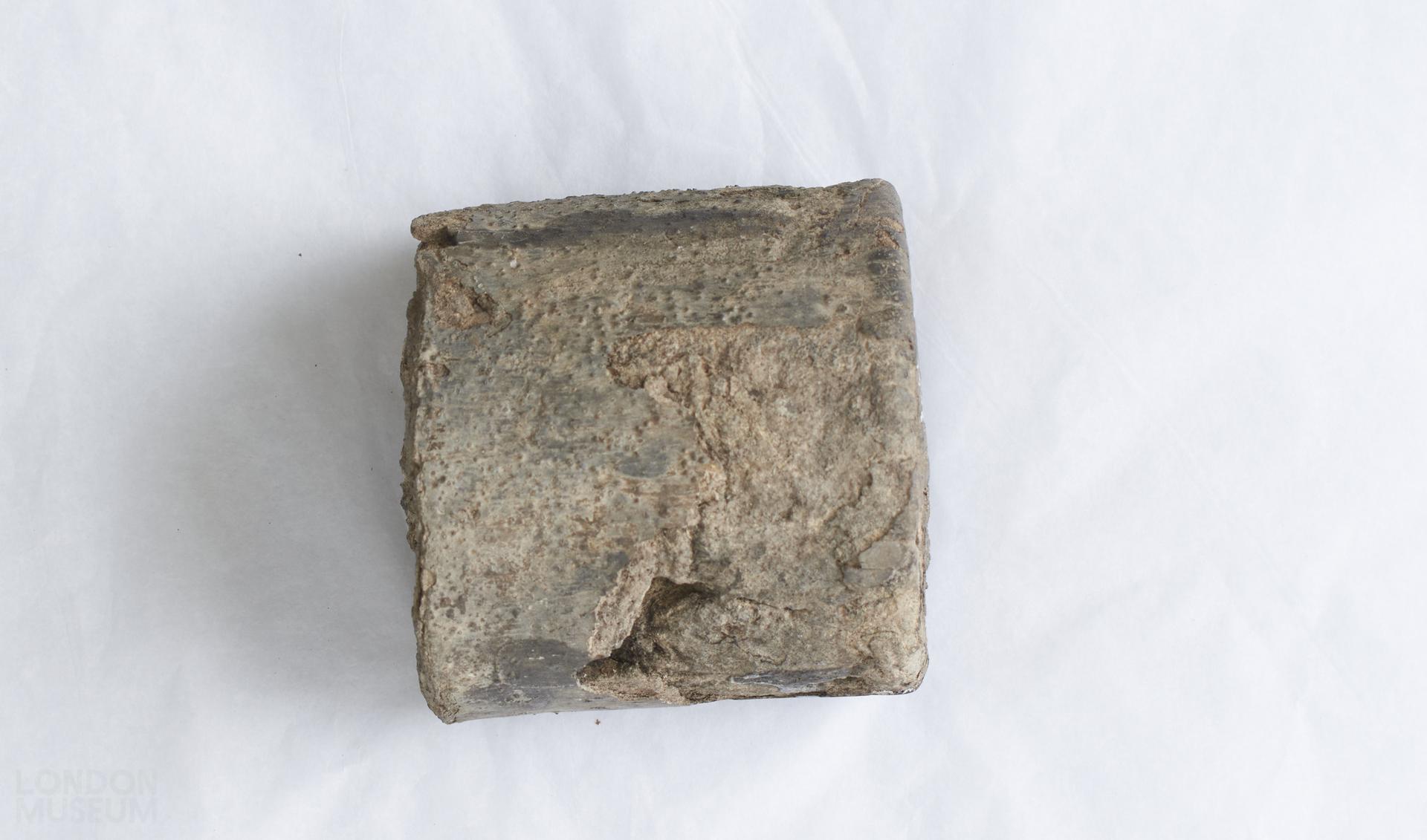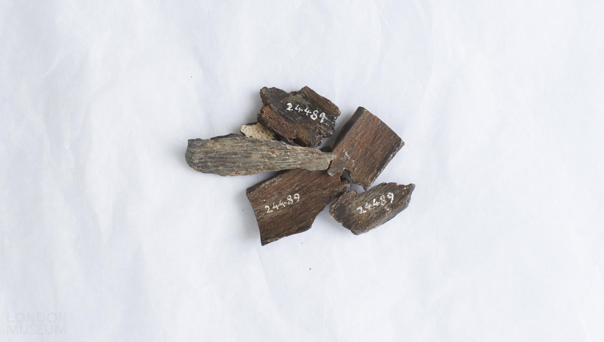 Fragments of a cylindrical turned box, contained solidified mass of lead carbonate surrounded by lead sulphide. 6 wood fragments and 4 lead fragments.