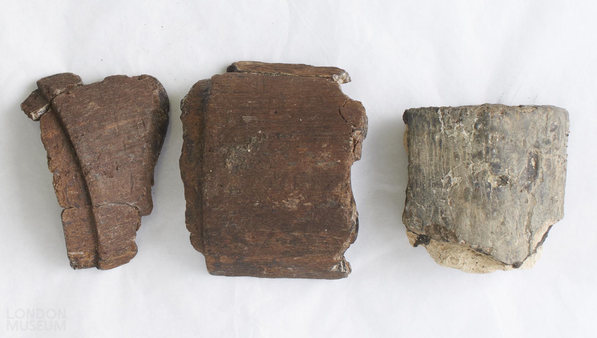 - H 58 mm, W 67 mm (largest wood fragment), H 59 mm, W 63 mm, D 40 mm (largest lead fragment), H 28 mm, W 13 mm, D 6 mm (smallest wood fragment), H 46 mm, W 15 mm, D 8 mm (smallest lead fragment)